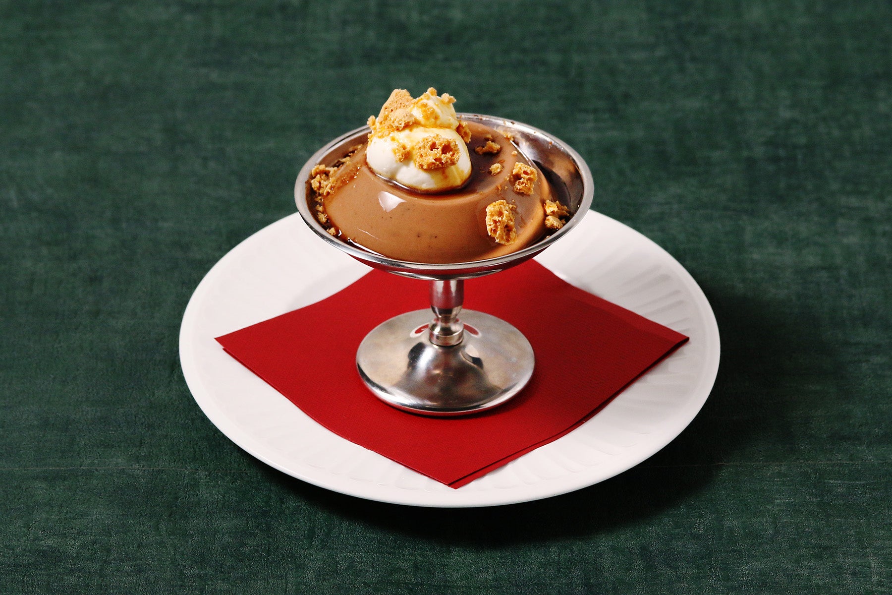 19世紀後半パリのカフェはコーヒーと並んでカカオ(チョコレート)とも深く結びついている*ことから着想を得た、ココア風味のプリンです。バニラビーンズの芳醇な香りをまとい、ほろほろとほどける焼き菓子・アマレッティの異なる食感が味わいを引き立てます。
