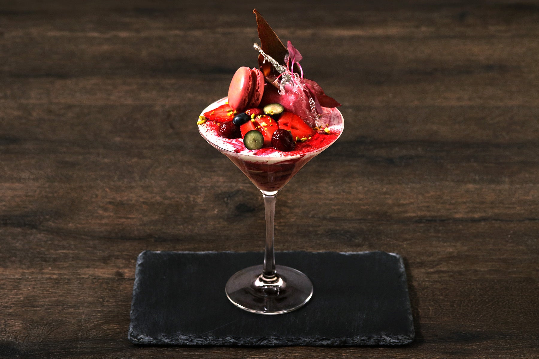 19世紀末のパリで一世を風靡したキャバレー「ムーラン・ルージュ」の煌びやかな光や、フレンチ・カンカンの華麗なショーをイメージした、アートな夜パフェです。濃厚なチョコレートに、カシスのジェラートやぶどう、白ワインのジュレの酸味が重なり合い、味わいに奥行きをもたらします。