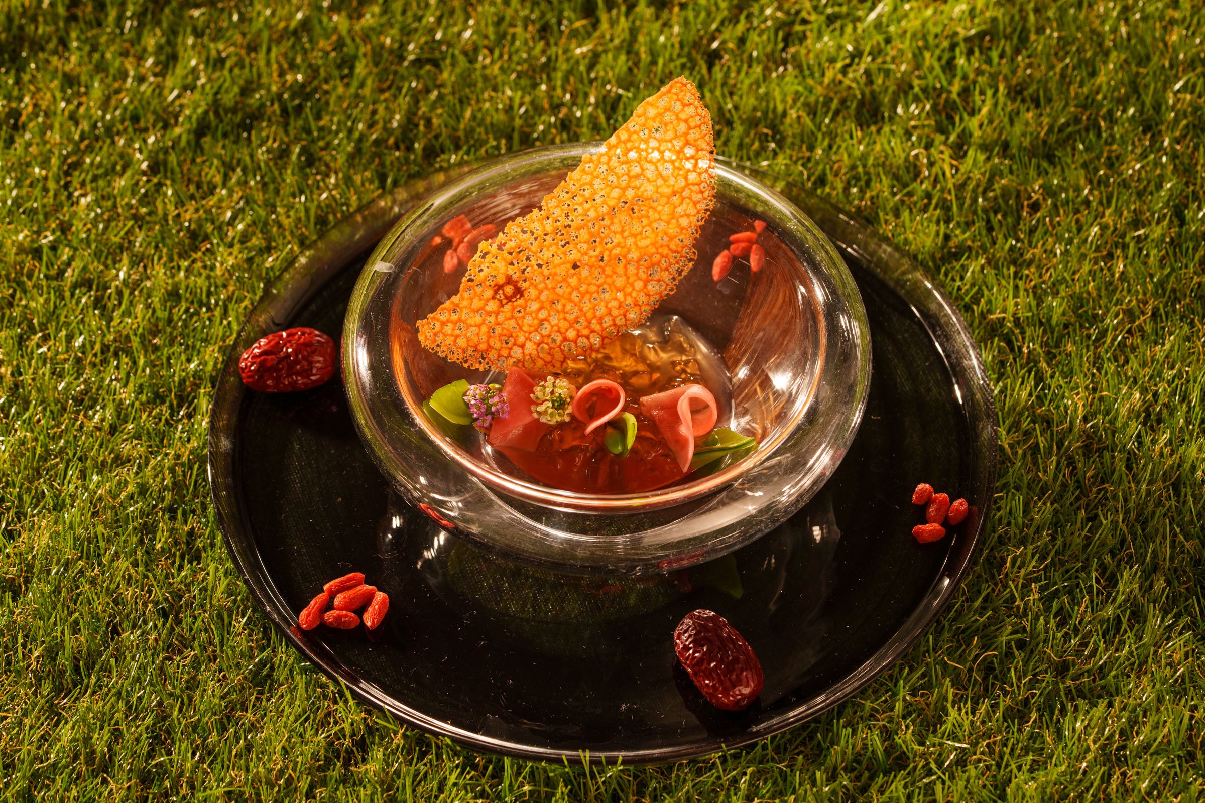「大切に育てていただいた食材を料理にしてみなさまにお届けする」ことをモットーに東北各地へお邪魔してその地を拝見し、生産者の方へ実際にお話を伺うことで料理のイメージが湧いてきます。宮城県北部の栗原市の牧場で育てられている新生漢方和牛は、14種類の漢方飼料で育てられていることから旨味成分が黒毛和牛の豊富といわれております。ロティやコンソメスープで異なる味わいをご用意し、東北の旬の味覚とともにお楽しみいただけます。
