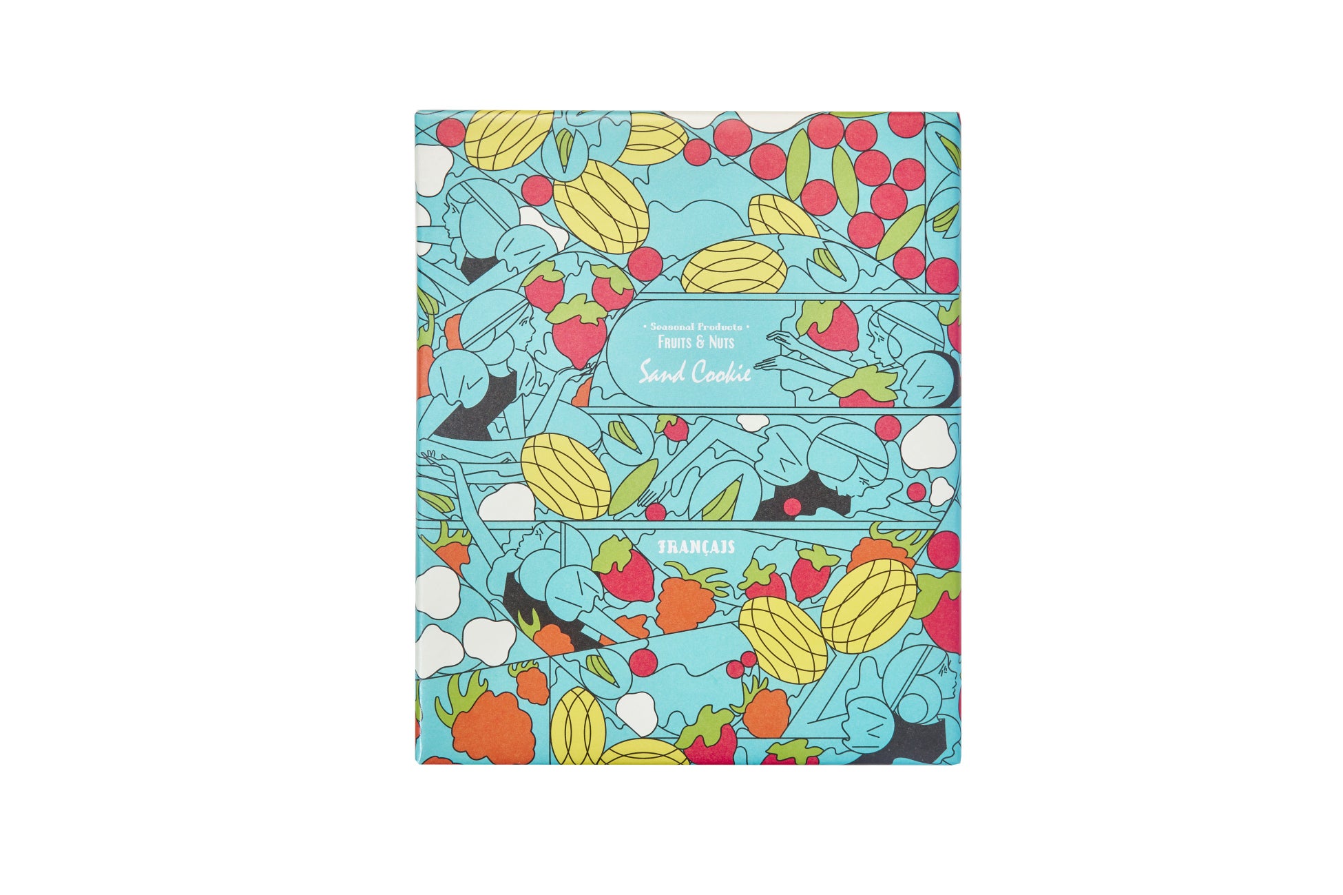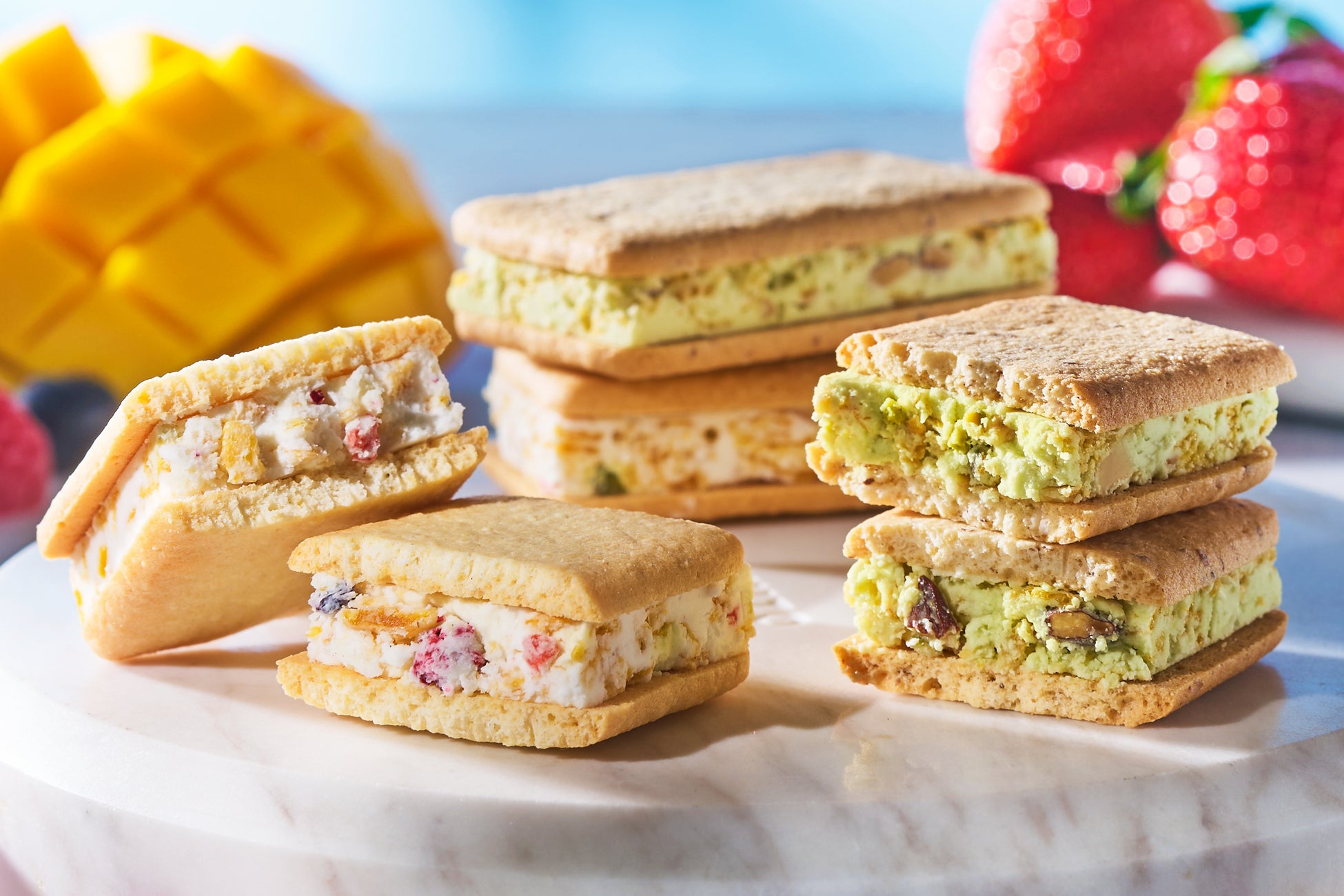 果実をたのしむサンドクッキー:5種類の果実の味をお楽しみ頂けるサンドクッキー。ブルーベリー、フランボワーズ、マンゴーのドライフルーツとピスタチオ。粒々のストロベリーをサクサクのコーンフレークと合わせて、エアチョコレートで包み込み、サンドしました。