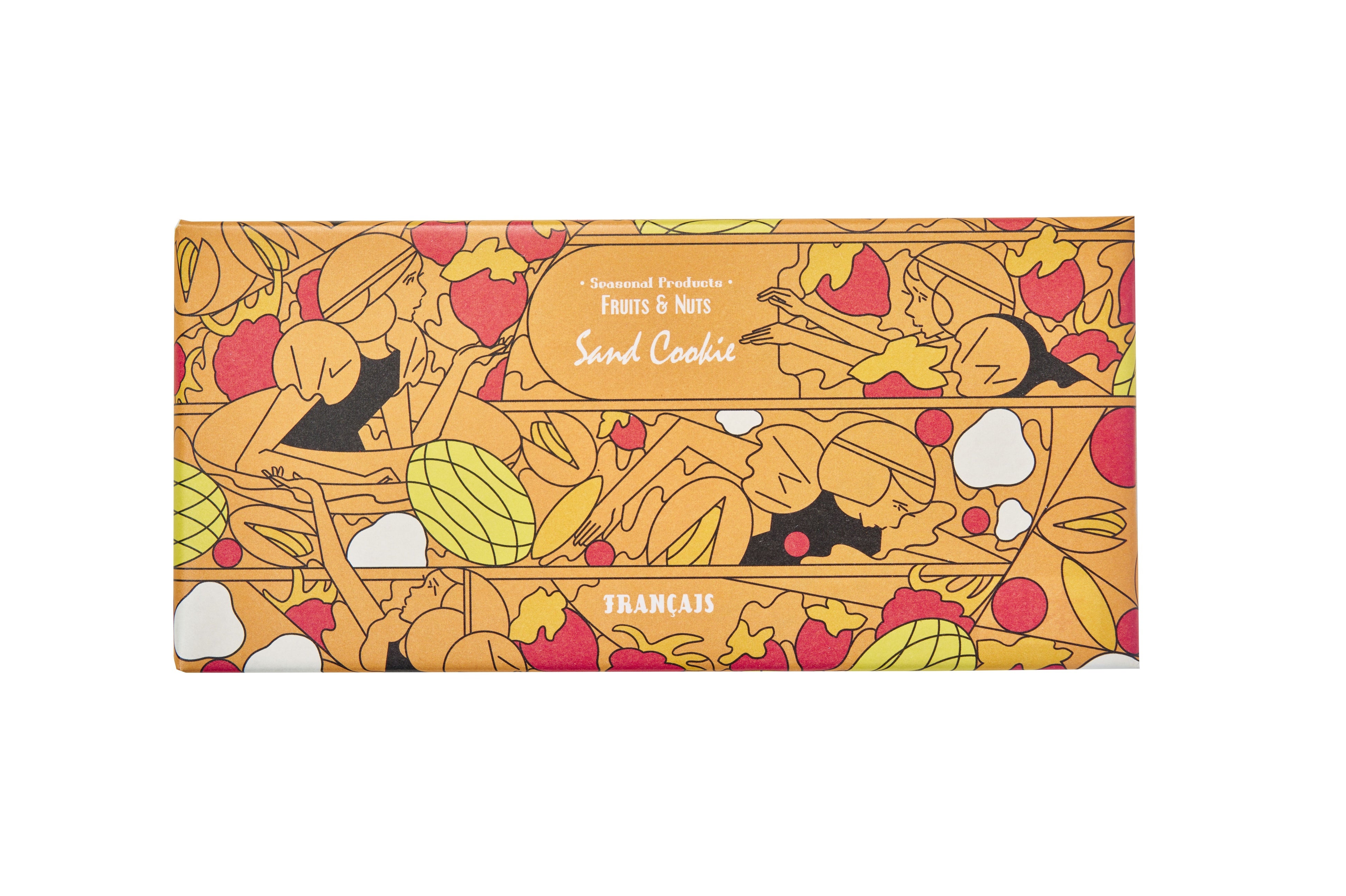 果実と木の実を、それぞれエアチョコレートで包んだ贅沢なサンドクッキーは、コーンフレーク入りで、サクサクとした食感が特徴です。