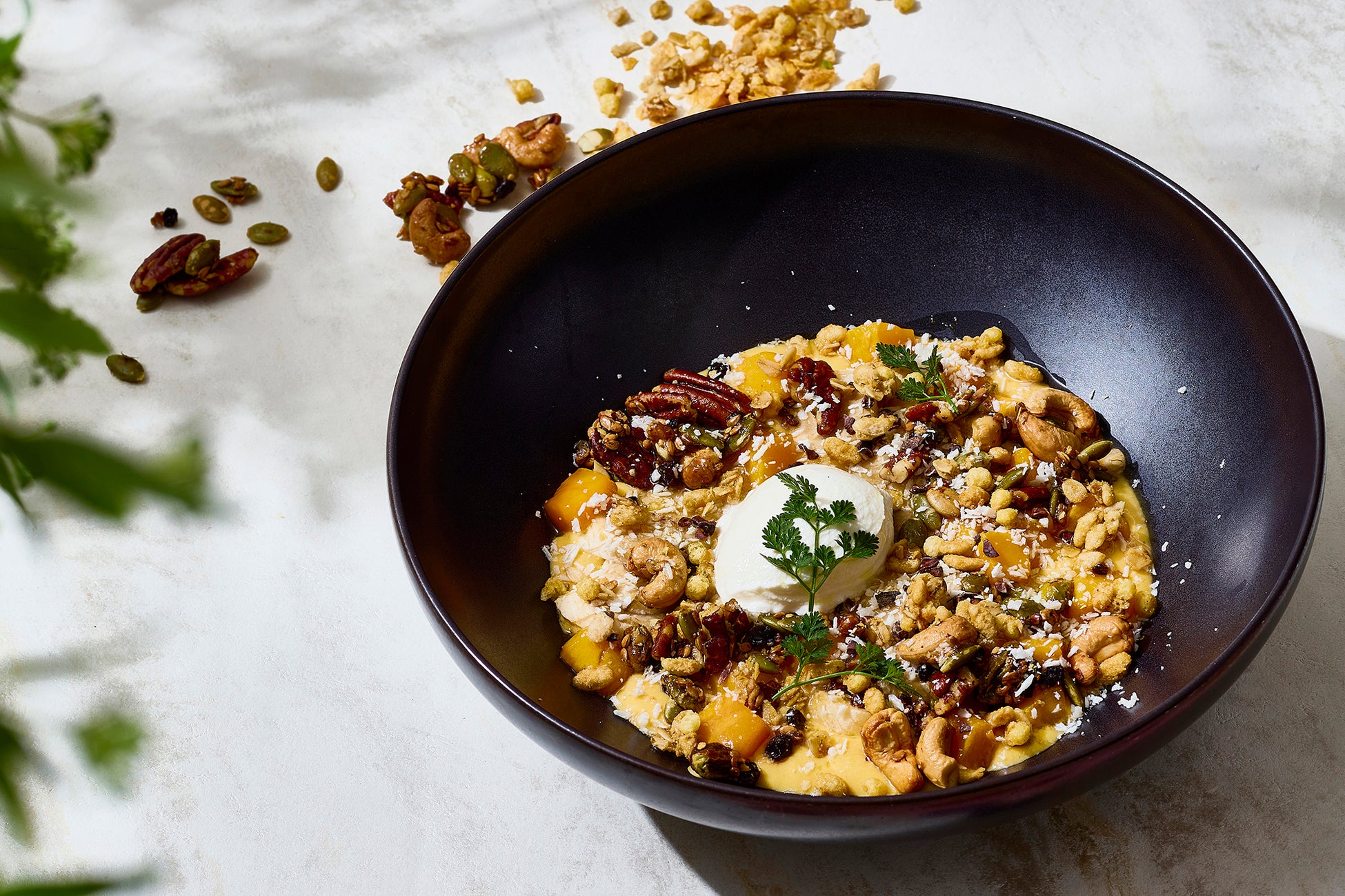 完熟マンゴーの濃厚な甘みと、バナナのまろやかさ、グリークヨーグルトの爽やかなコクが溶け合うビタミンカラーの砂糖不使用のヨーグルトボウル。アサイー&ベリーと同じく、ザクザクとした自家製グラノーラの食感に加え、フレッシュなマンゴーとバナナをトッピングしました。さらに、スーパーフードの「カカオニブ」の苦味と「ココナッツフレーク」の甘い香りをアクセントに添えることで、南国のエナジーを感じる重層的な味わいをお楽しみいただけます。