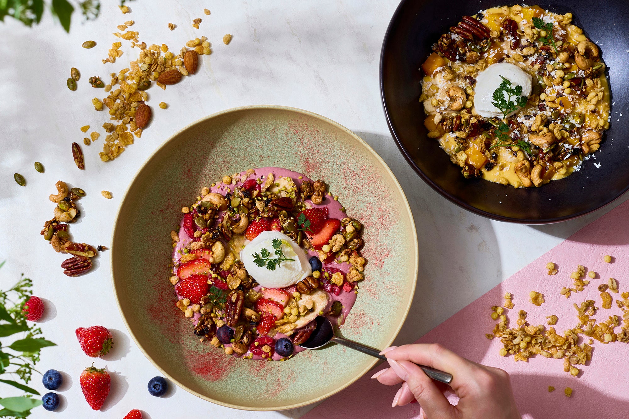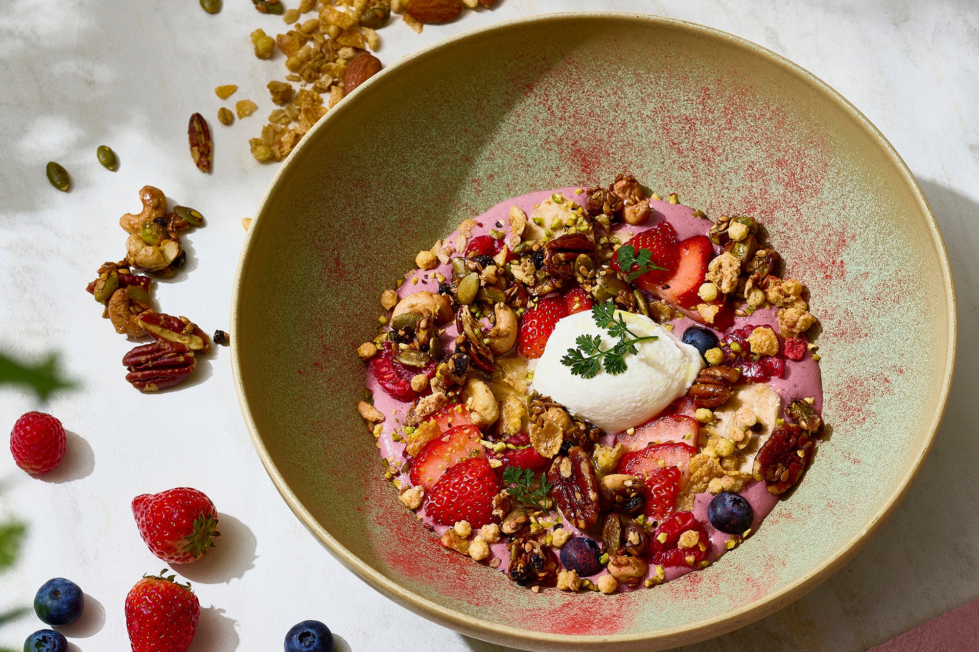 スーパーフードのアサイーとビタミン豊富ないちご、エネルギー源となるバナナと高タンパクなグリークヨーグルトを贅沢にミックスしたクリーミーな砂糖不使用のベース。その上には、ナッツやパンプキンシードなどのザクザクとした食感とローストされた香ばしさが広がる自家製スーパーフードグラノーラと、ほのかな甘みの小粒のグラノーラを敷き詰めました。フレッシュないちご、ブルーベリー、ラズベリー、バナナを彩り豊かに配し、仕上げには追いグリークヨーグルトを添えることで、最後の一口までより満足感のある「食べる美容液」のような一皿に仕上げています。
