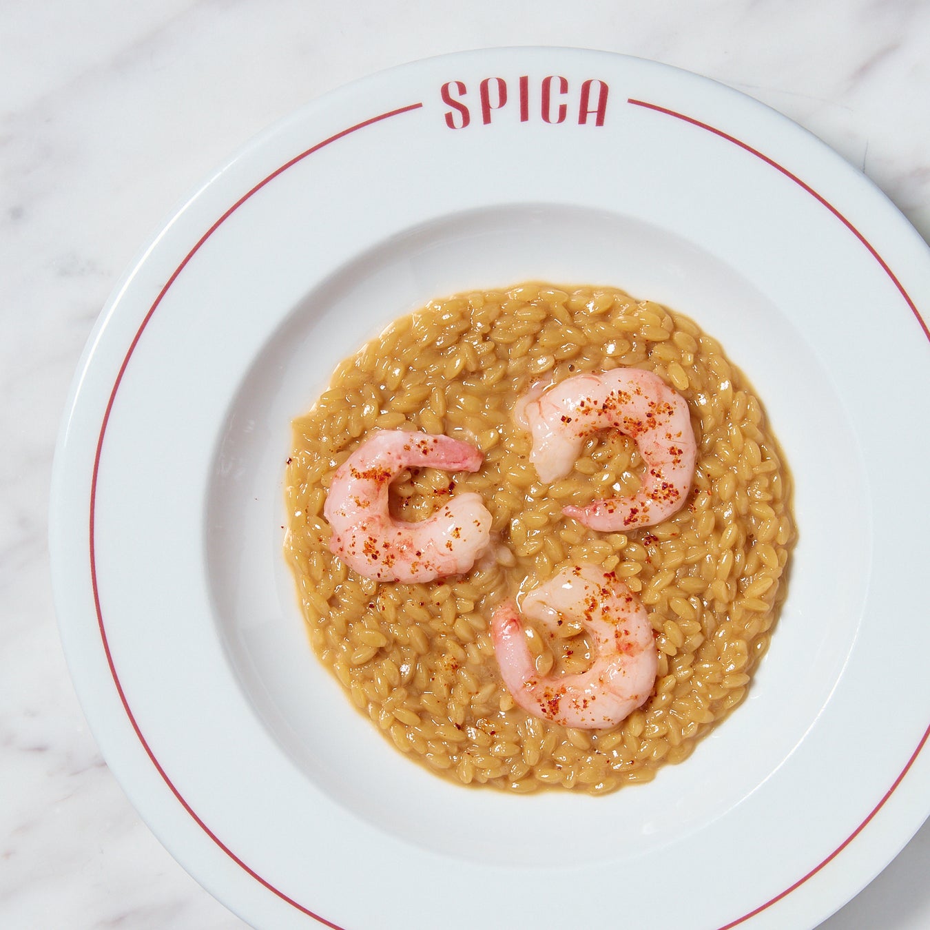 甲殻類の殻から抽出した濃厚な出汁で炊き上げた、SPICAの代名詞。パルミジャーノの塩気と甘海老の甘みが重なり合う、海の香りを存分に楽しめる一皿です。