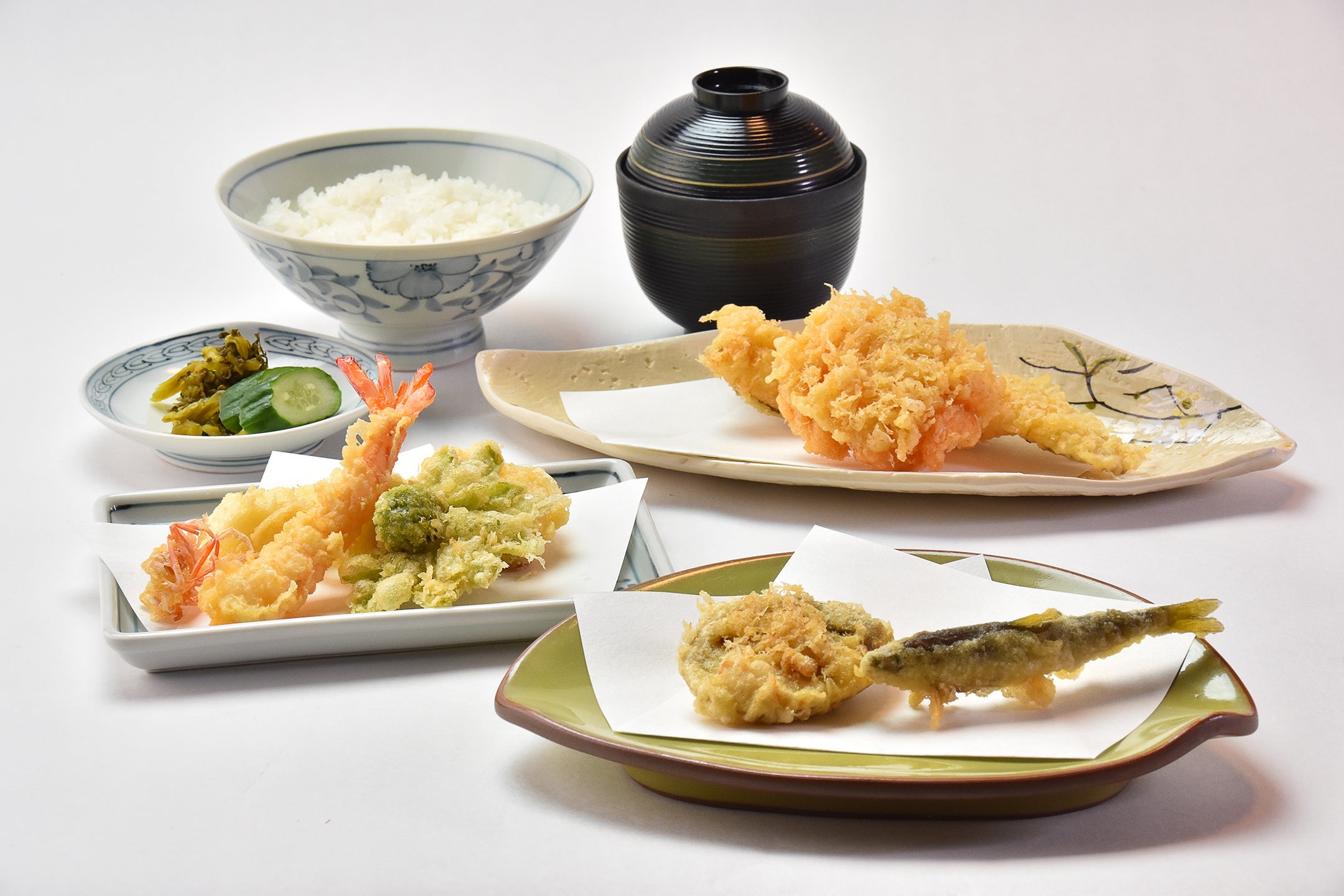 車海老、いか、魚介、野菜二品、蛤姿揚げ、口替り、穴子、かき揚げ、お揃い(ご飯、味噌汁、香の物)
