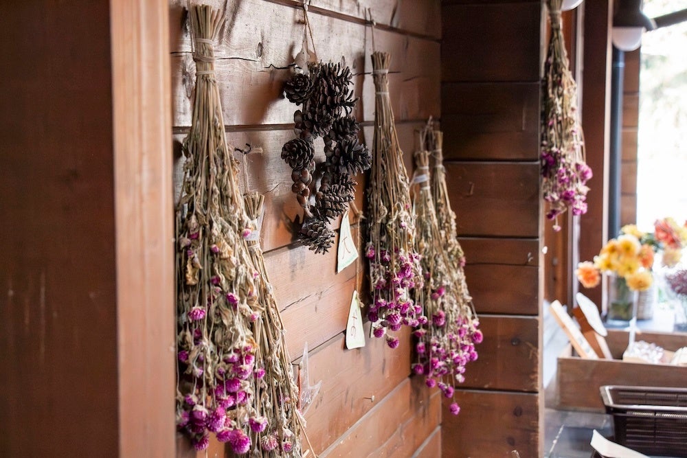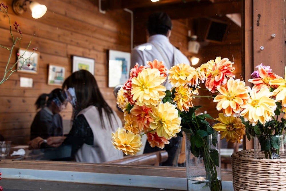 建物は木材を基調とした温かみのある造りで、生花やドライフラワーといったアイテムがより自然感を演出。街の喧騒から離れた、山あいならではの穏やかな空間で憩うことができます。