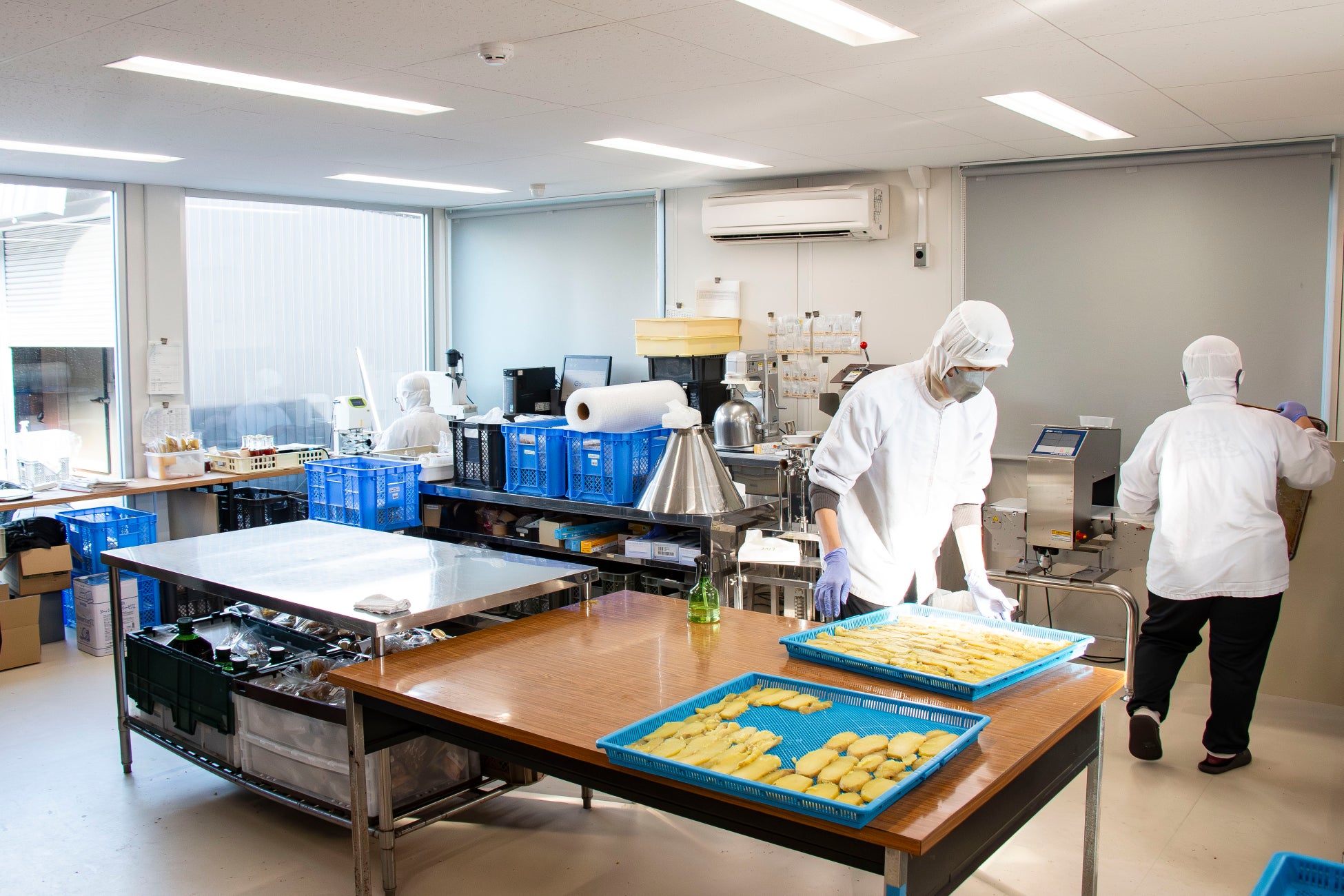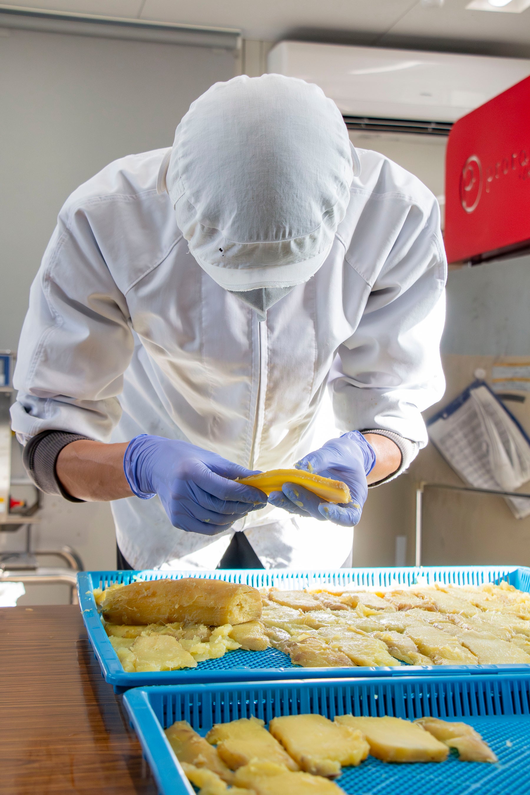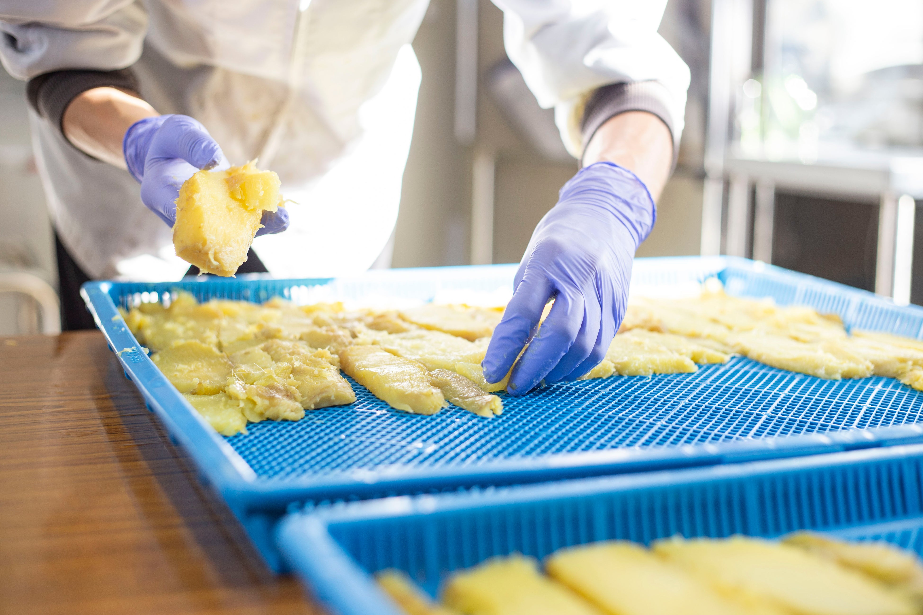 収穫したさつまいもは、加工がしやすいようにひげ根を落として洗浄。この段階で選別も行い、色が白かったり黒かったりする部分を除きます。その後は芋を蒸し、皮を剥いてスライス状に。下準備が整ったら、乾燥機へ入れて完成を待ちます。出来上がった干し芋は包装して梱包。これら全ての過程に障害のある方々が関わっており、社会参加の場となっています。