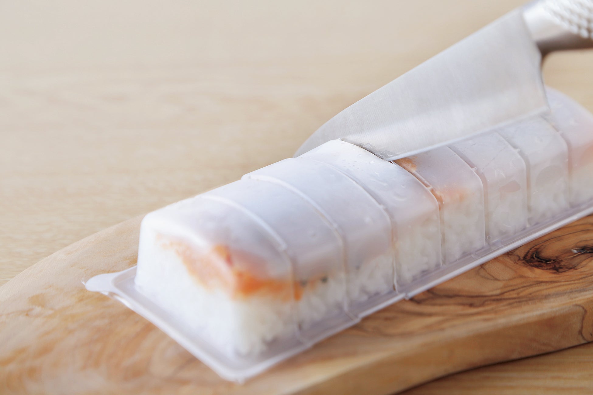 食感、旨みを引き出し食べやすくするために、いかに切れ込みを入れる「隠し包丁」のひと手間もかけています。ネタやシャリに圧力がかかりすぎないように設計された専用の容器を使って生産しているため、一般的な押し寿司とは違いふっくらとした口当たりです。