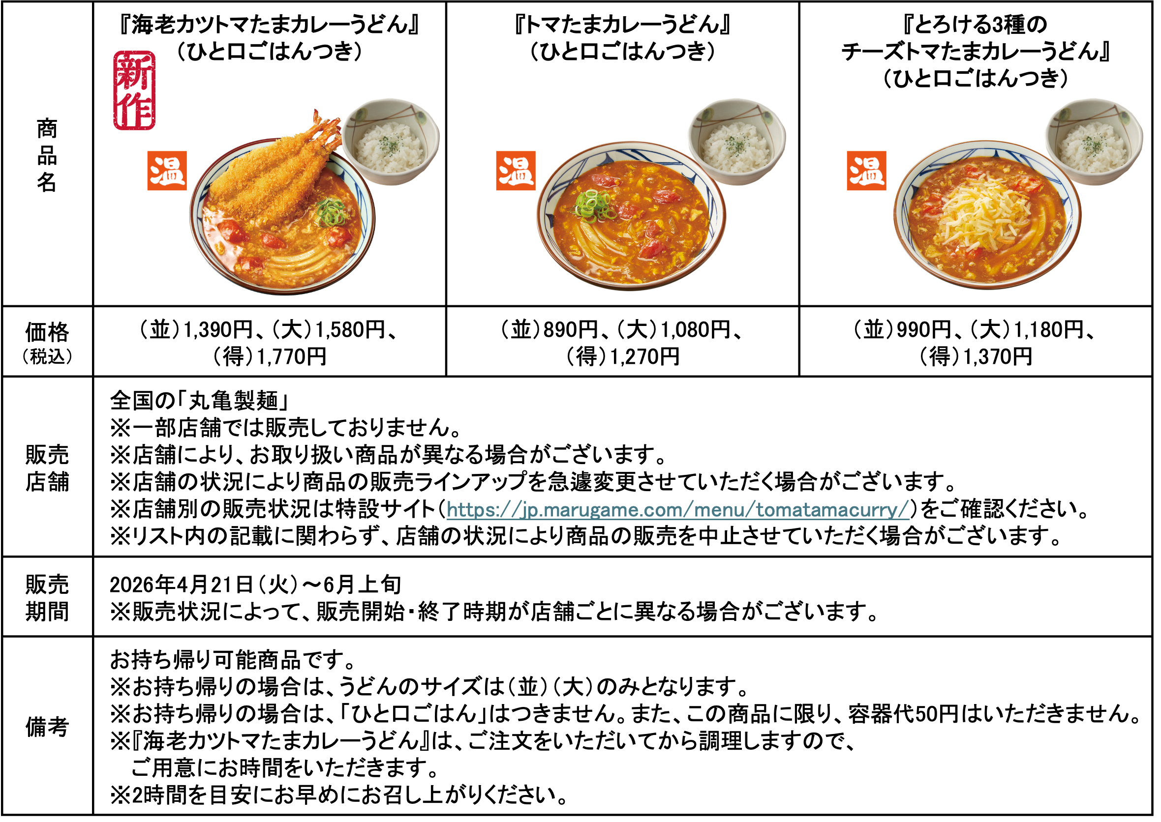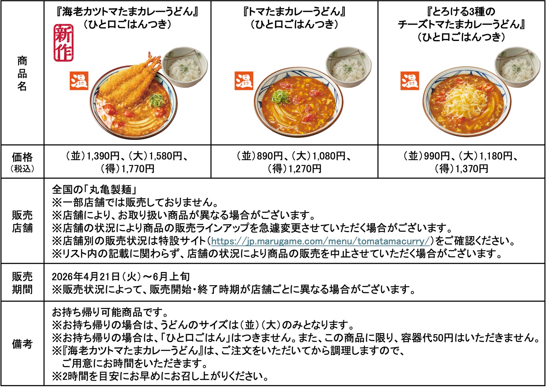 発売6年目を迎える今年は、毎年再販を熱望する声を多数いただく『トマたまカレーうどん』『とろける3種のチーズトマたまカレーうどん』に加え、大胆に海老を3尾も重ねて揚げた新作『海老カツトマたまカレーうどん』を、2026年4月21日(火)から全国の「丸亀製麺」にて期間限定で発売いたします。