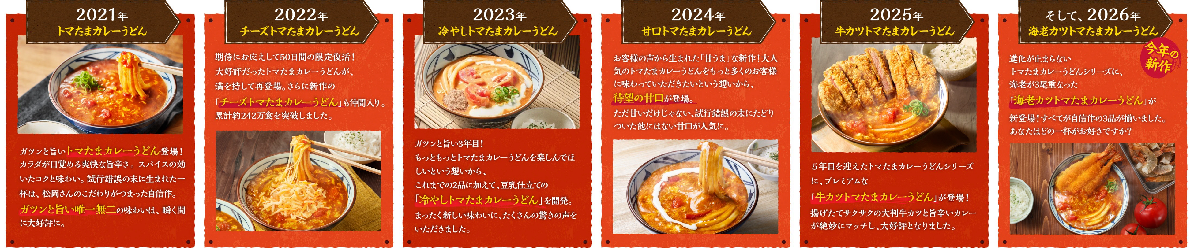 2021年に登場した『トマたまカレーうどん』は、翌2022年には、再販を待ち望む声にお応えして限定復活を果たすとともに、新たに『チーズトマたまカレーうどん』が仲間入り。2023年には『豆乳仕立ての冷やしトマたまカレーうどん』、2024年にはまろやかで奥深い風味が大好評となった『甘口トマたまカレーうどん』を発売するなど、トマたま特有の奥深いコクと程よい酸味はそのままに、進化を続けてまいりました。5年目となる2025年には、プレミアムな『牛カツトマたまカレーうどん』が誕生。シリーズ登場以来、「トマたまカレーうどんシリーズ」は、ガツンとした旨さと辛さがやみつきになる一杯として、多くのお客さまに支持され進化を続けています。