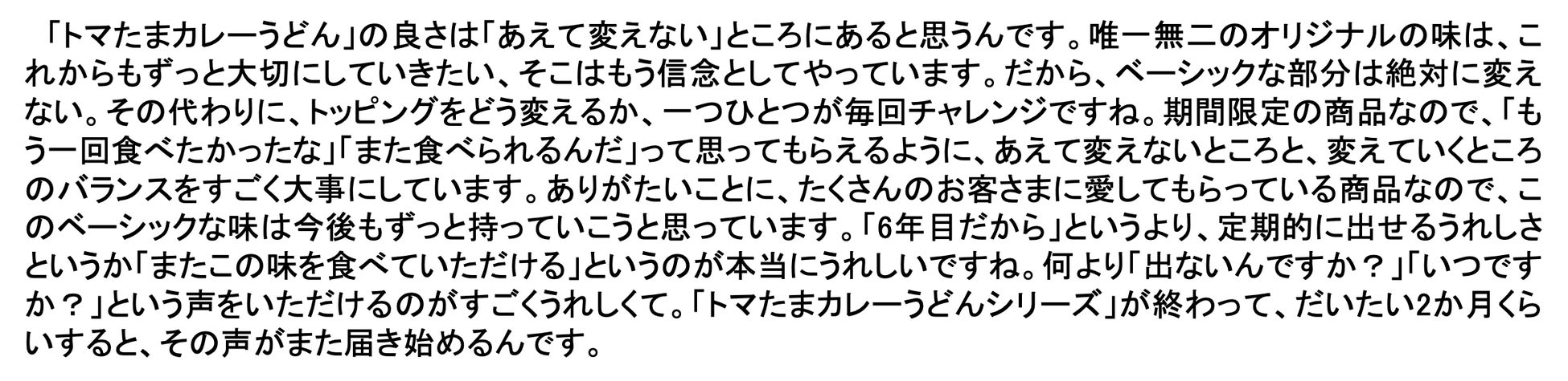 Q1. 今年で6年目を迎える「トマたまカレーうどんシリーズ」ですが、毎年多くのファンに支持される中で、今年はどのような“進化”を目指されたのでしょうか?また、変わらないおいしさと進化のバランスについても教えてください。