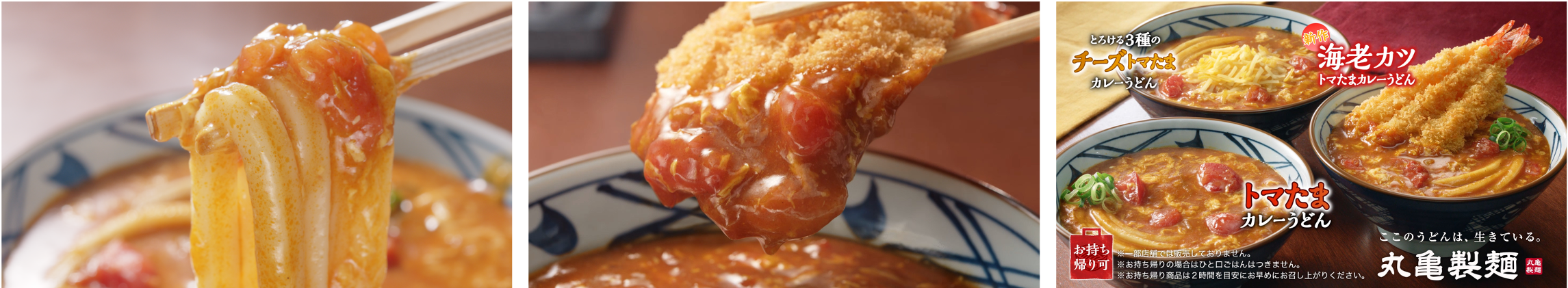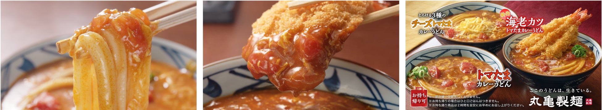 「トマたまカレーうどんシリーズ」初※となる魚介のバランスを考え抜きたどり着いた、『海老カツトマたまカレーうどん』と、人気の『トマたまカレーうどん』『とろける3種のチーズトマたまカレーうどん』を味わえるのは今だけ。ぜひ、進化を続ける『トマたまカレーうどん』をお楽しみください。