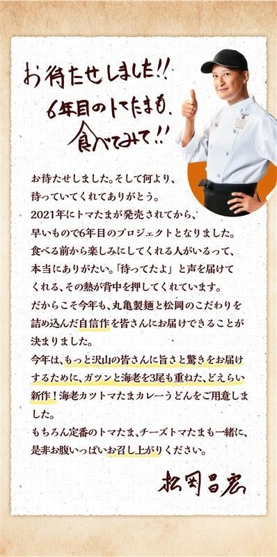 株式会社丸亀製麺(本社:東京都渋谷区、代表取締役社長:山口 寛)が展開する、食の感動体験を追求し、手づくり・できたてにこだわる讃岐うどん専門店「丸亀製麺」は、2021年の発売以来、累計販売数1,200万食※を超える大人気「トマたまカレーうどんシリーズ」を、松岡昌宏さんとともに共同開発してまいりました。