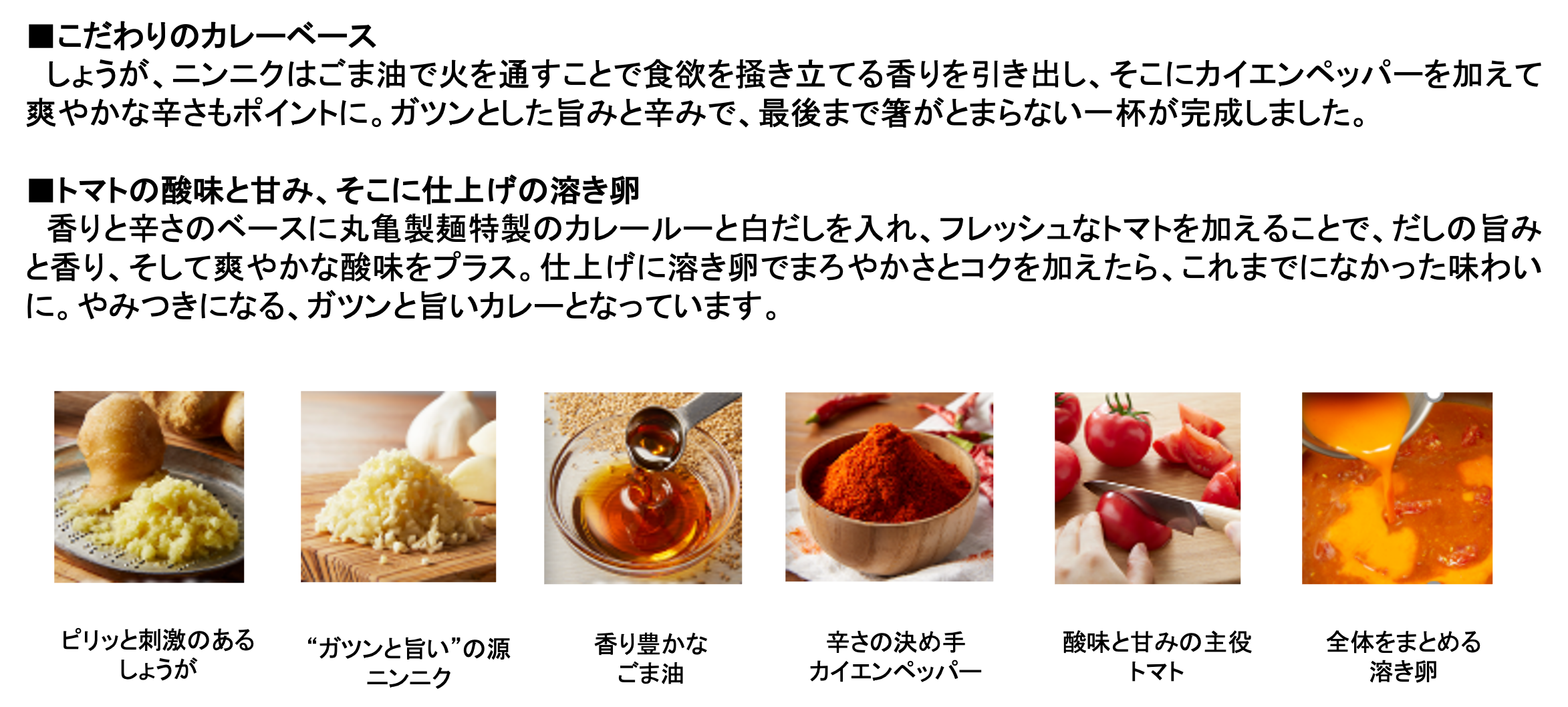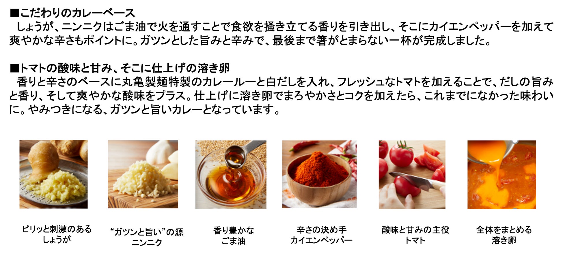 打ち立てうどんとの相性も大切にしつつ最後までおいしく食べていただけるよう松岡昌宏さんと試行錯誤を重ねた末、たどり着いた『トマたまカレーうどん』。しょうが、ニンニクをごま油でじっくり火を通すことで食欲を掻き立てる香りを引き出します。カイエンペッパーを加えることで爽やかかつ、ガツンとした辛さのこの一杯は丸亀製麺でしか味わえません。
