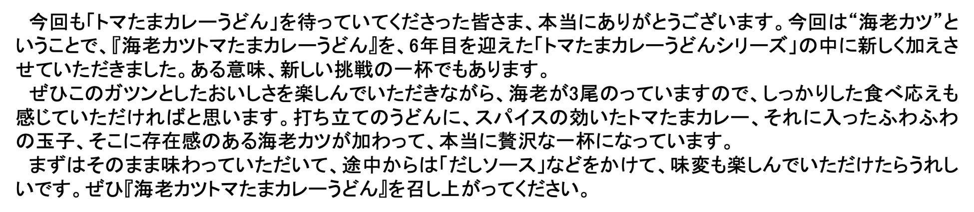 Q5. 最後に、新作の『海老カツトマたまカレーうどん』の登場を楽しみに待っているお客さまに向けて、一言お願いします。