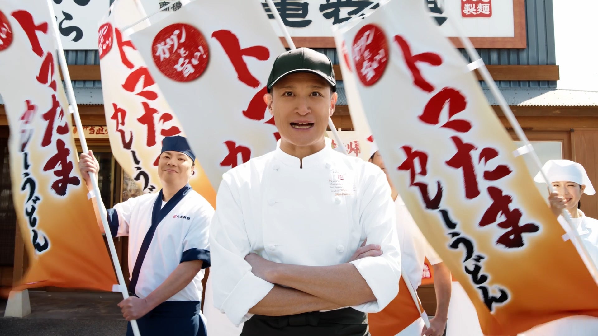 丸亀製麺の実店舗で撮影された今回の新TVCMは、丸亀製麺の開発チームと同じコックコートに身を包んだ松岡さんの「おーい!今年もきたぞー!」という力強い呼び声からスタート。のぼりが風になびく様子や、麺職人たちの表情から「トマたまカレーうどんシリーズ」が帰ってきたことへの期待感が伝わります。新作『海老カツトマたまカレーうどん』の海老カツを揚げるシーンでは、丸亀製麺と共同開発者である松岡さんのこだわり抜いた一杯が生み出される瞬間の臨場感が描き出されています。さらに、「えび・エビ・海老の!」という迫力のあるセリフとともに、『海老カツトマたまカレーうどん』を差し出す松岡さんの自信に満ちた表情が印象的です。最後は、『海老カツトマたまカレーうどん』と、復活を遂げた『トマたまカレーうどん』『とろける3種のチーズトマたまカレーうどん』を加えた全3商品が並び、圧倒的な迫力とともに締めくくられます 。