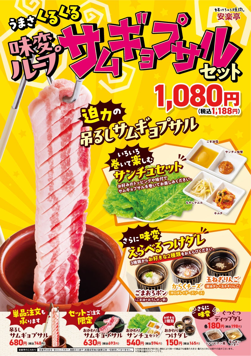 焼肉レストラン 安楽亭(本社:埼玉県さいたま市)では、2026年4月16日(木)より、新メニュー「味変ループ サムギョプサルセット」を、安楽亭店舗(一部店舗を除く)にて販売開始いたします。