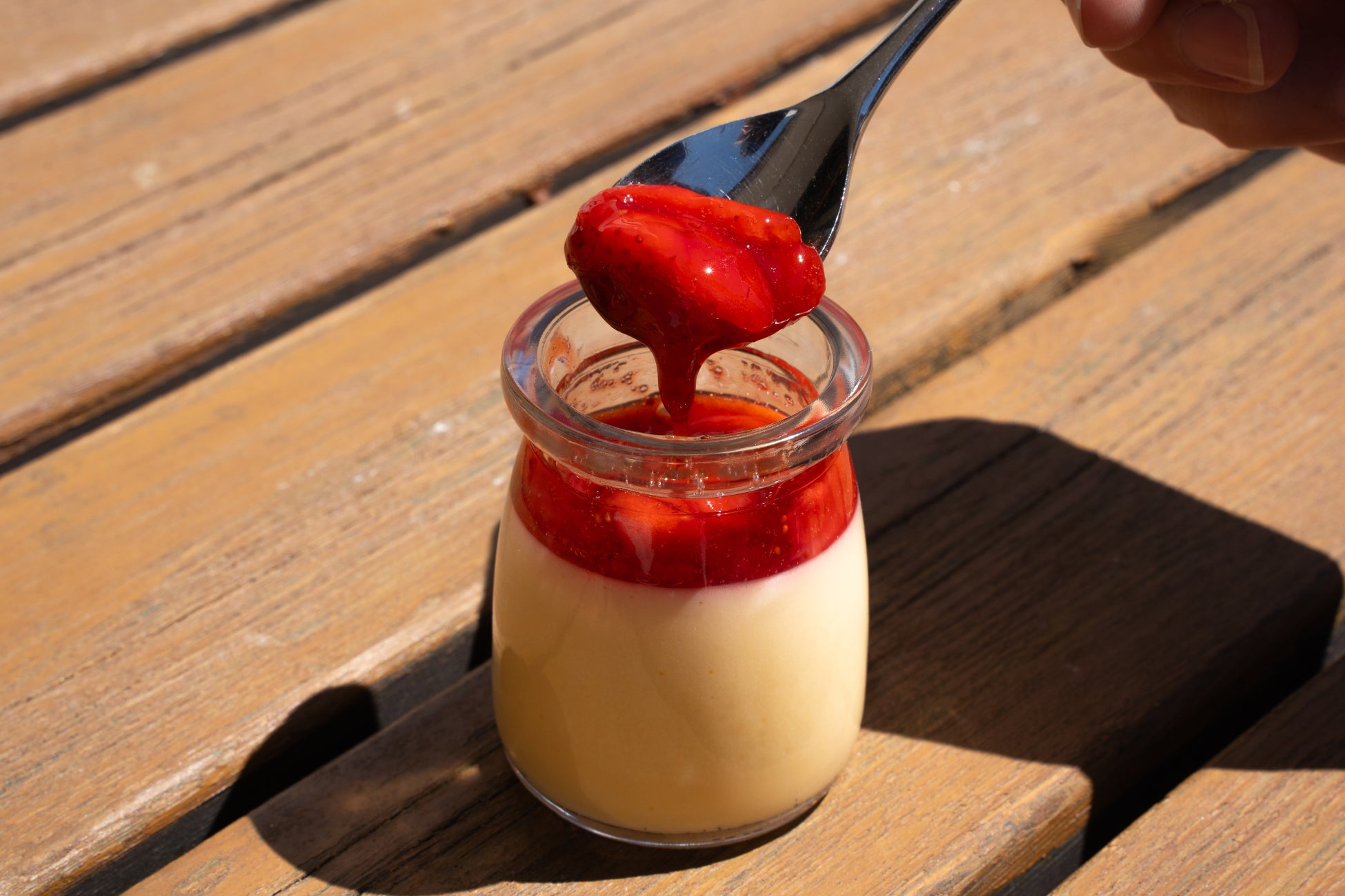 贅沢な完熟苺ソース プリンの上部には、苺の果肉をゴロゴロと残した特製ソースをたっぷりとかけました。苺本来の甘酸っぱさと香りが、濃厚なプリンの甘みを引き立てます。