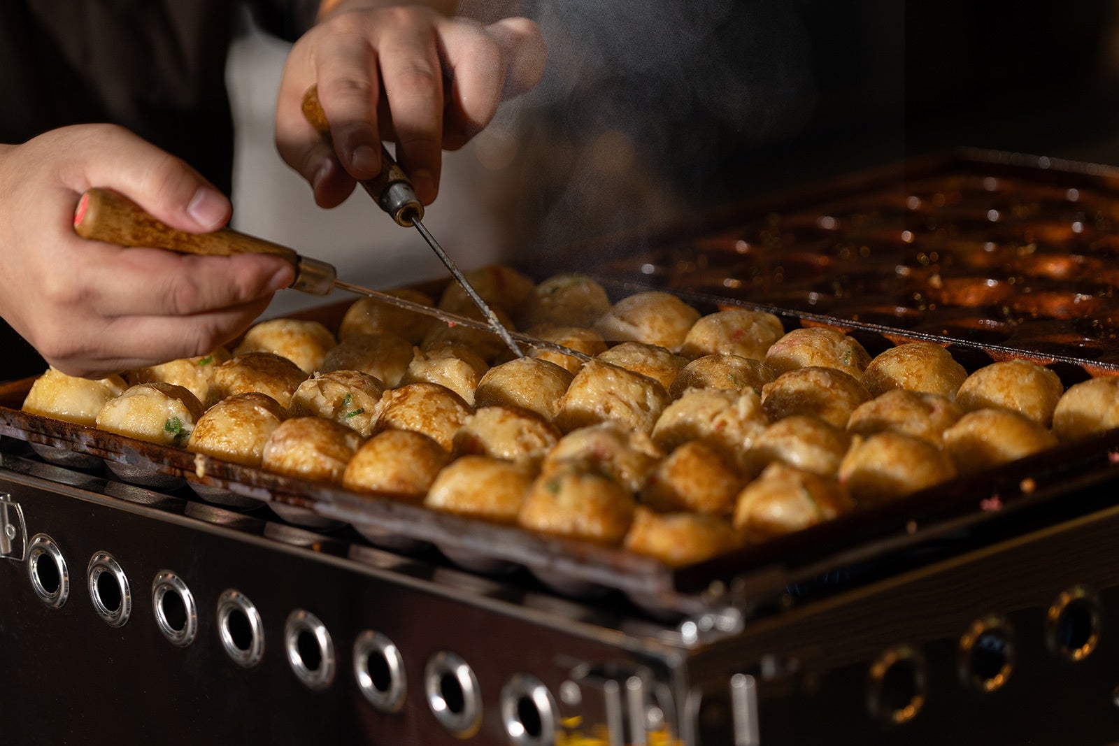 関西風ふわとろ食感が楽しめる『笑たこ』は、熟練の技術で油で揚げずに焼き上げたヘルシーなたこ焼きが特徴です。本場関西の「ふわっ」「とろっ」の食感にこだわり、蛸、粉、葱、水など使用する全ての食材を厳選。最低限の油でカロリーを抑え、身体にやさしく表面はさくっと、そして中は熱々トロトロの食感が楽しめます。人気の商品『塩ねぎマヨたこ焼き』や女性に人気の『明太マヨたこ焼き』の定番メニューから、期間限定の味まで、バラエティ豊かなメニューをご用意しております。