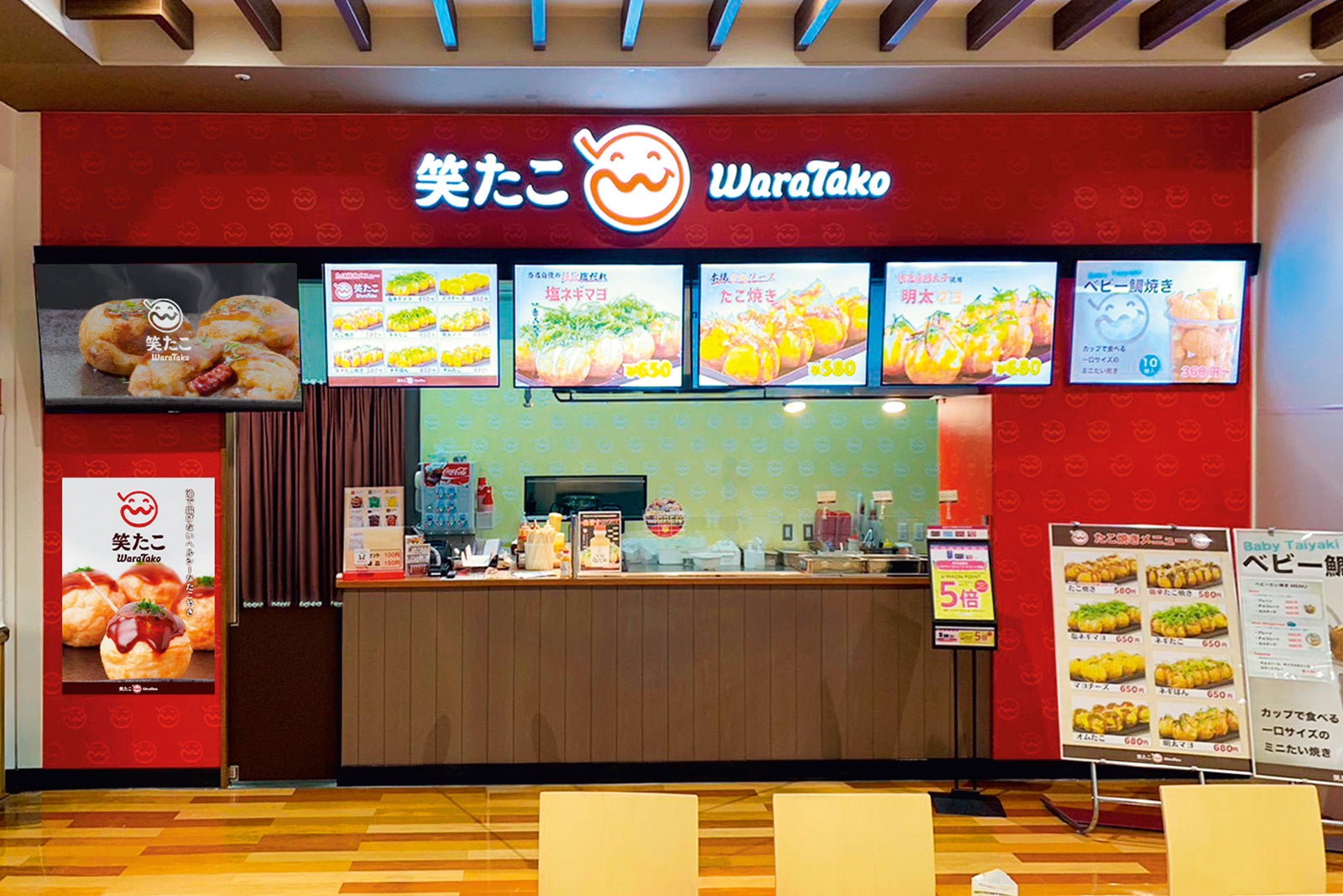全国に、関西風たこ焼き店「笑たこ」、クレープ専門店「スマイリークレープ」、クレープ&ドリンク専門店「TUTU」、台湾発祥のグローバルティーカフェ店「WHO’S TEA」、本生わらび餅専門店「響堂」という5ブランドを展開。