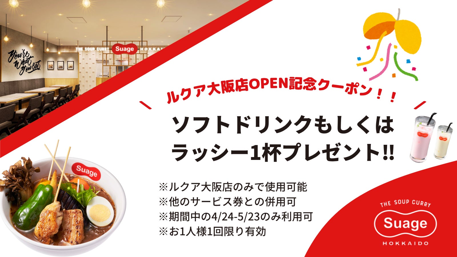 株式会社Suage Japan(本社:東京都渋谷区、代表取締役:竹下 遼)は、北海道スープカレー専門店「Suage」の関西初進出となる「北海道スープカレーSuage ルクア大阪店」を、2026年4月23日(木)にルクア大阪10階(大阪市北区梅田)にオープンします。大阪駅直結という関西最大級の玄関口を起点に、北海道産食材と製法にこだわった一杯を届けます。