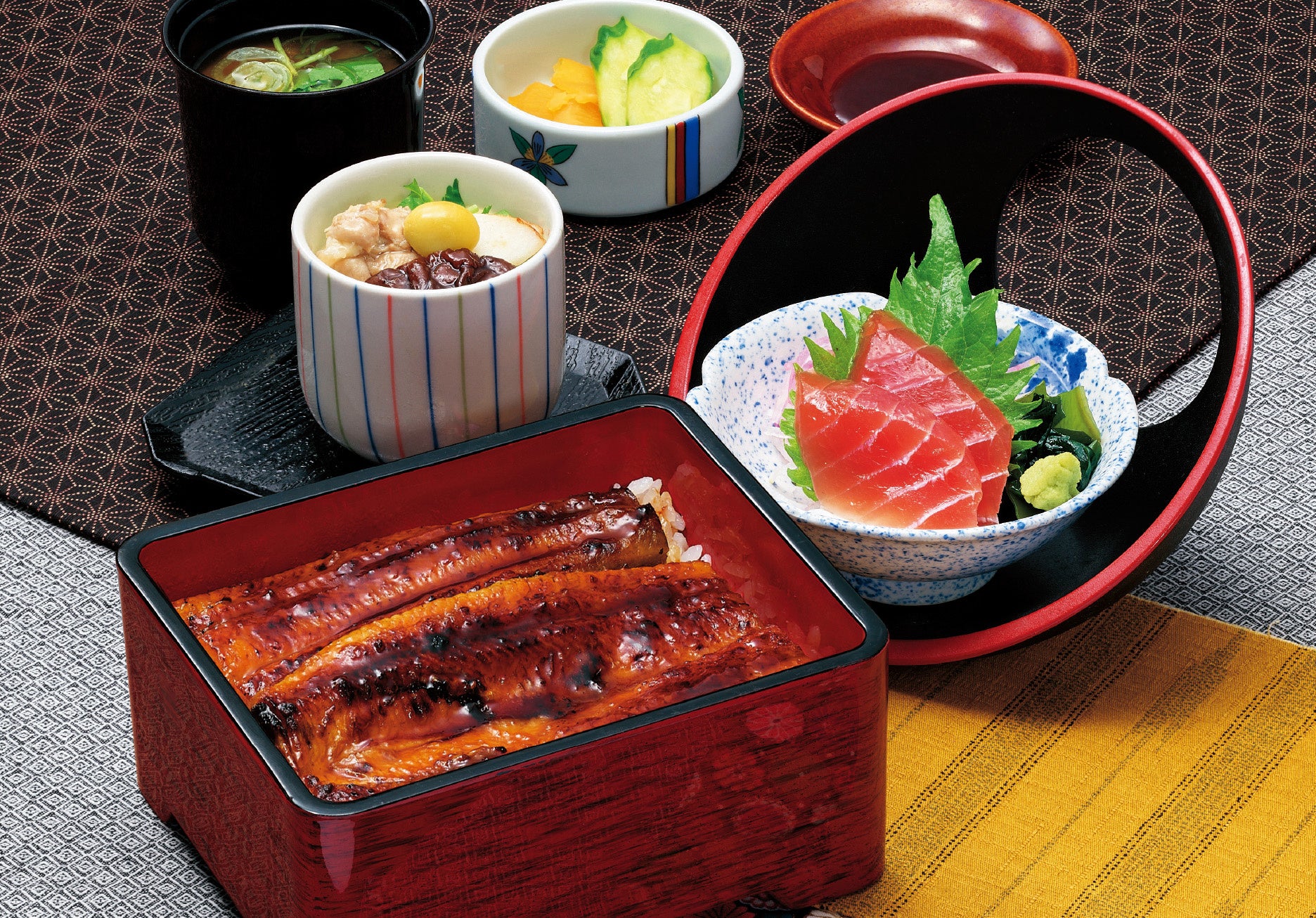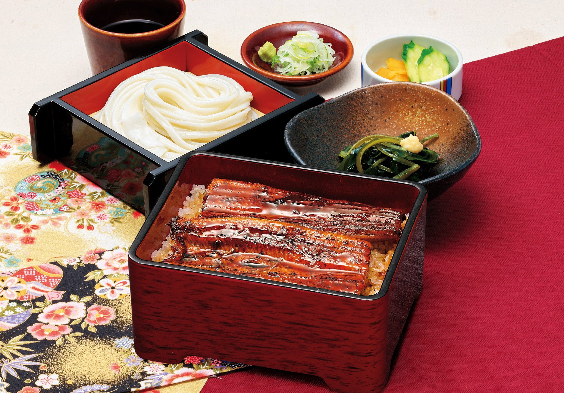 うな重と手延べうどん、酢の物が付いたセットメニューです。