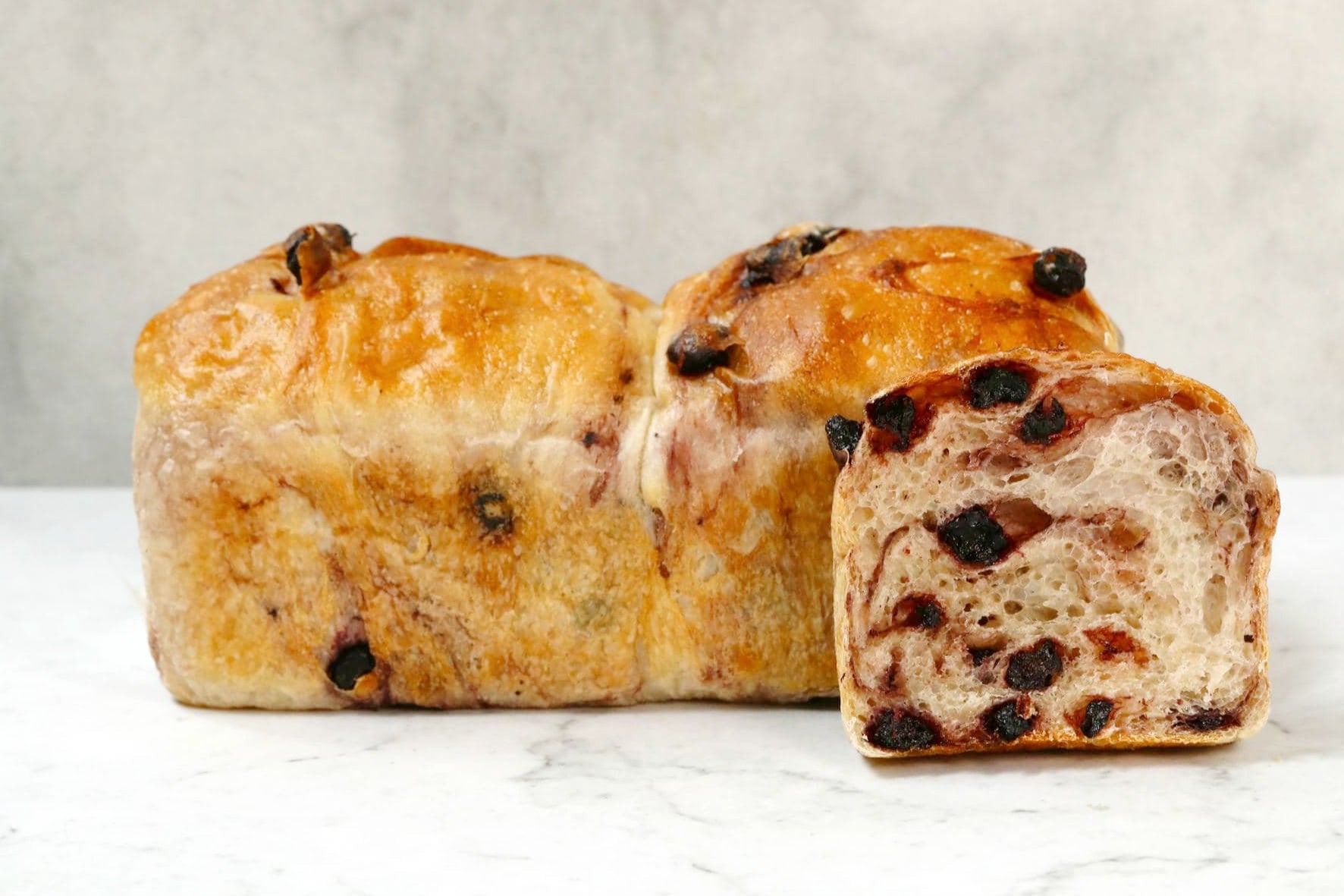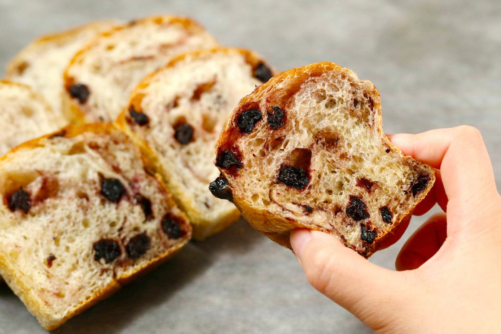 ブルーベリーを練りこんで“食パン”に仕上げました。もっちり、しっとりとした食感ととも