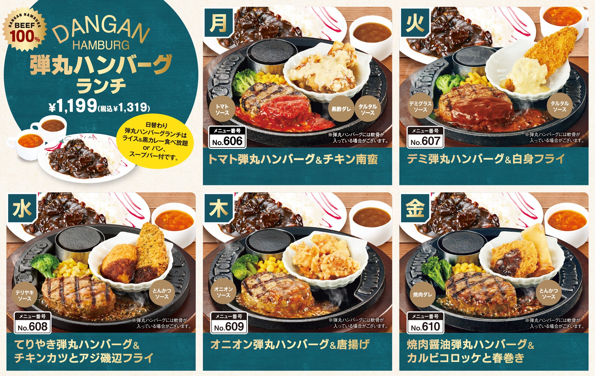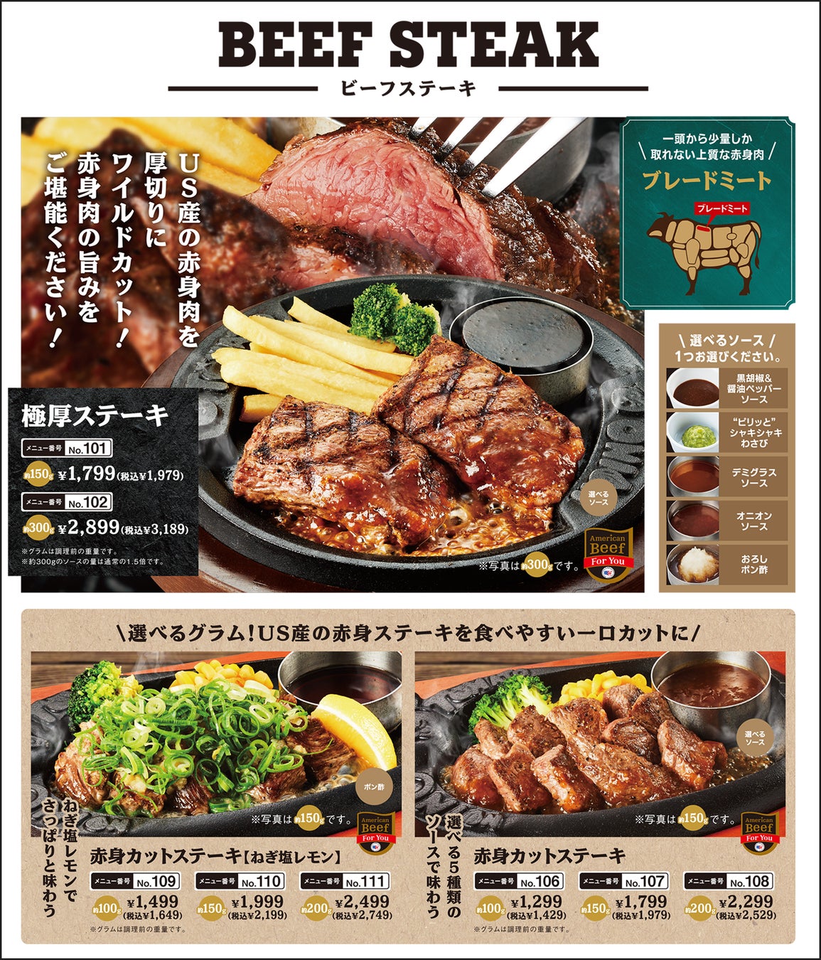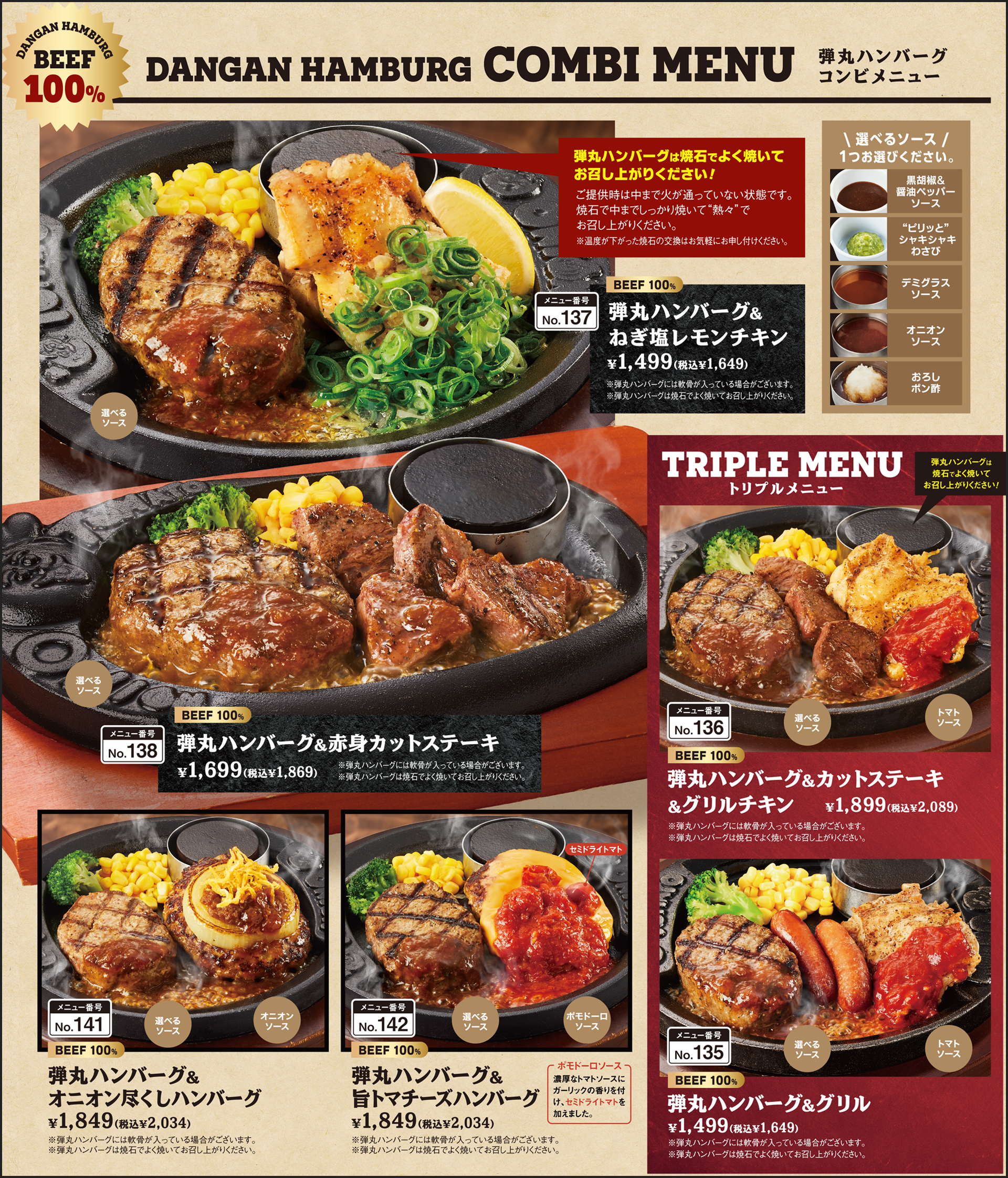 看板メニューの「弾丸ハンバーグ」をはじめとして、人気の鉄板メニューのラインナップがさらに充実。新たにステーキが新登場。さらにコンビメニューも増えて、一度に様々なメニューをお楽しみいただけるようになりました。