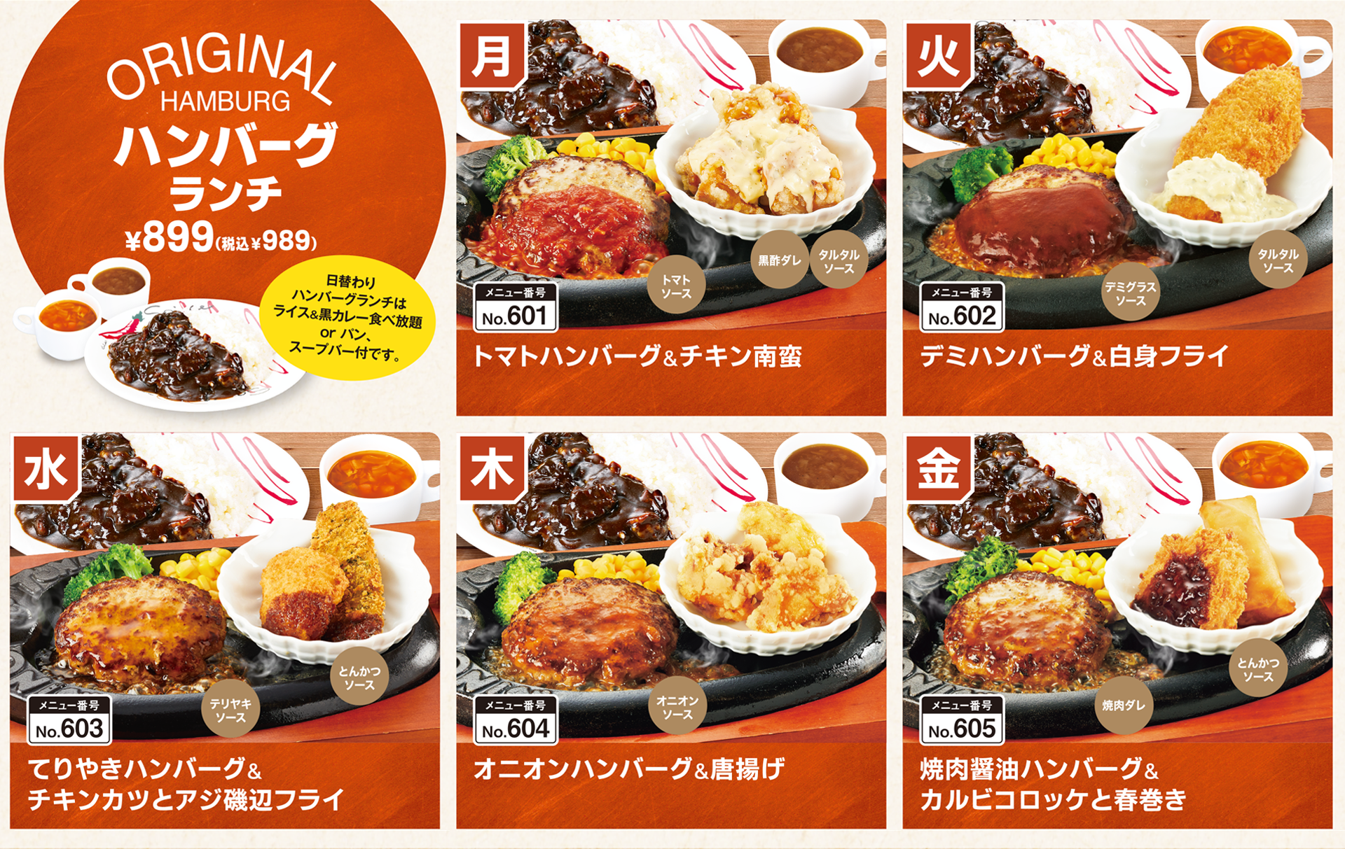 平日限定でご提供している日替わりハンバーグランチの価格を見直し、よりお求めやすい価格でご提供いたします。※15時まで