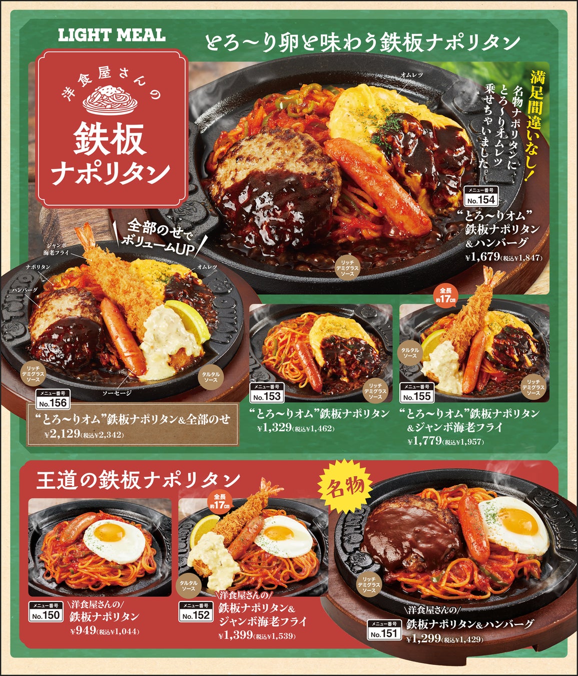 オムライスやパスタ、和食などのメニューの魅力がパワーアップ!お客様のご要望にお応えして、オムライスのごはん大盛りが可能に、さらにナポリタンはトッピングのバリエーションが増えました。