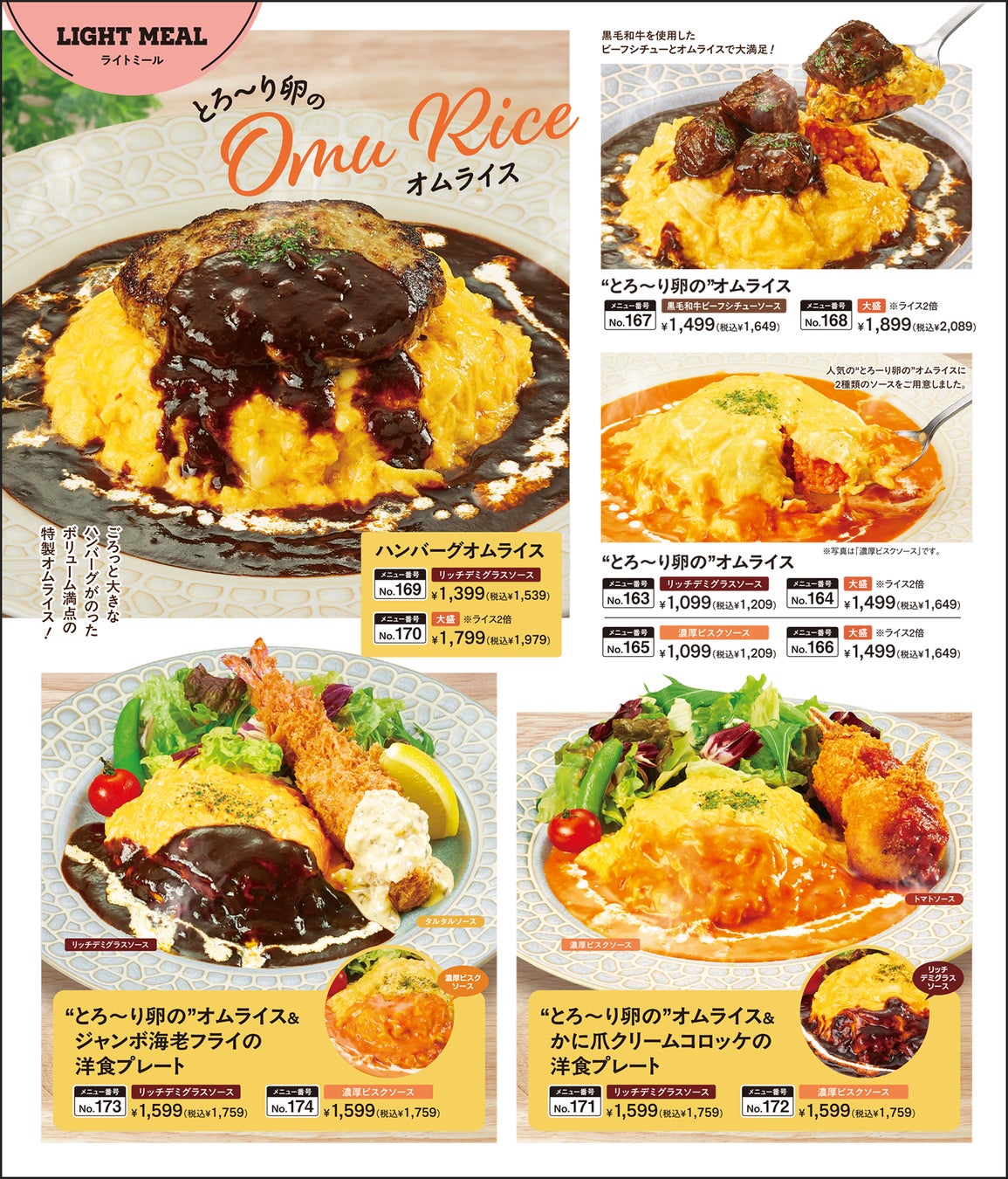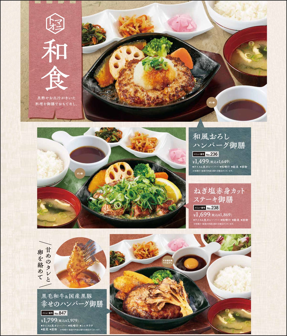 人気の高いハンバーグやステーキのラインナップを、より充実させました。また、オムライスやナポリタン、和食に至るまでバラエティを拡充し、あらゆる世代のお客様にお楽しみいただける内容へとブラッシュアップいたしました。さらに、平日限定の日替わりハンバーグランチは価格を見直し、よりお求めやすくご提供いたします。