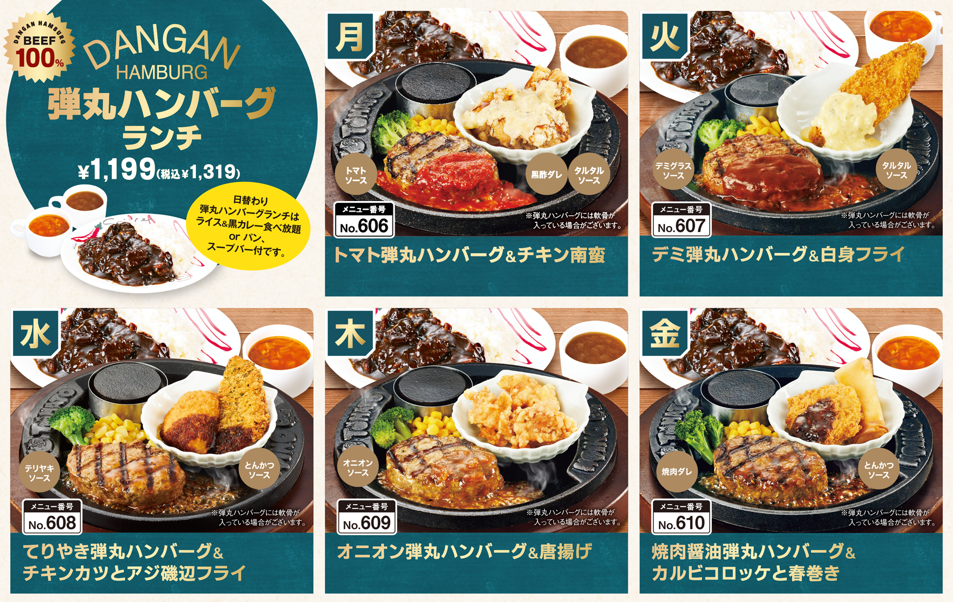 また、一番人気の「弾丸ハンバーグ」もランチ限定で、お手頃なセット価格にてご提供しております。
