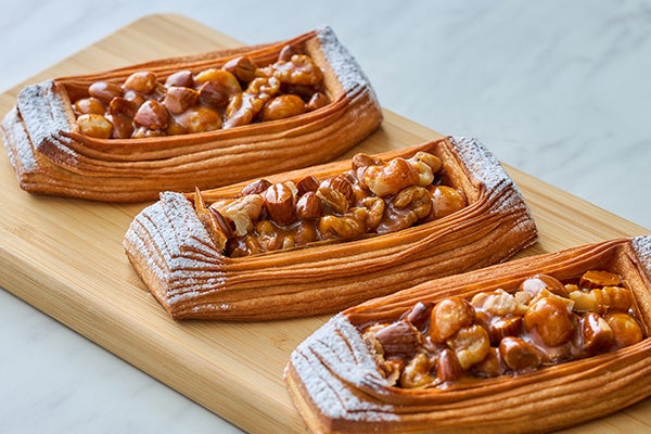 何層にも折り重ねた繊細な層が魅力のデニッシュ生地にチョコレートクリームを絞り、キャラメリゼしたマカダミアナッツ、アーモンド、くるみの3種類のナッツを乗せて焼き上げました。噛むたびに弾けるナッツのカリッとした食感と香ばしさ、キャラメリゼのほろ苦い甘みがデニッシュ 生地と見事に調和した、多層的な食感が楽しいデニッシュです。