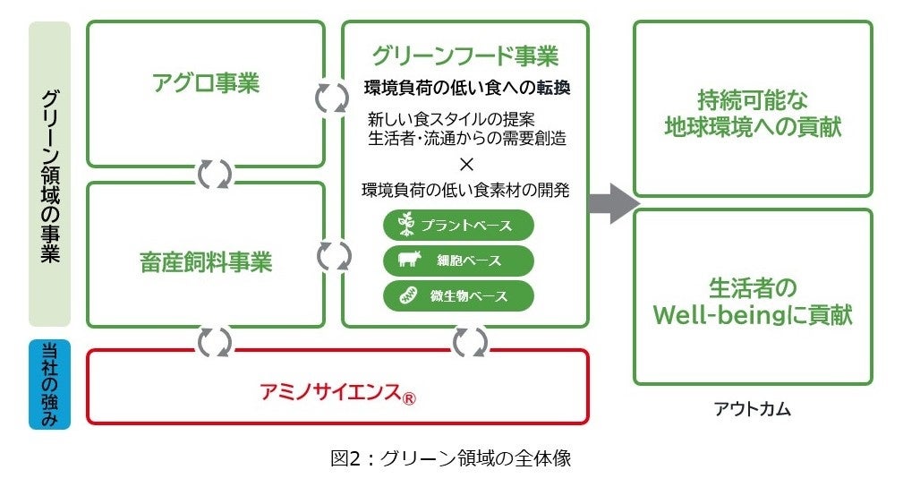 当社は「アミノサイエンス®で、人・社会・地球のWell-beingに貢献する」という志(パーパス)の下、中期ASV経営 2030ロードマップにおいて、市場の成長性と社会価値の高い4つの重点成長領域で飛躍的成長を目指す基本方針を掲げています。本技術の開発はその一つ、グリーン領域の中核となるグリーンフード事業を加速させる環境負荷の低い食素材の開発活動として位置づけられます(図2)。細胞性食品のバリューチェーンの中には、細胞そのものの販売をはじめ、培地や成長因子等の培地成分の販売、それらを使った培養技術開発・生産支援サービス、さらには食品加工、細胞性食品の製造・販売に至るまで複数のプロセスが存在し、当社にも多様な事業機会が広がっています。それらいずれも当社の強みであるアミノサイエンス®が十分生かせる分野であり、まずはバイオ医薬/再生医療用培地事業で培った技術と知見を活用し、培地・培地成分販売や培養技術開発・生産支援での事業参入を目指します(図3)。当社は今後も細胞性食品の社会実装を支援し、持続可能なアグリフードシステムの構築に貢献します。