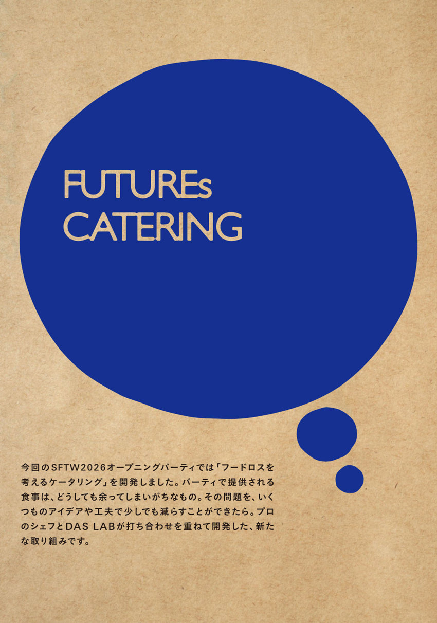 今回の SFTW2026 オープニングパーティでは「フードロスを考えるケータリング」を開発しました。パーティで提供される食事は、どうしても余ってしまいがちなもの。その問題を、いくつものアイデアや工夫で少しでも減らすことができたら。プロのシェフとDAS LABが打ち合わせを重ねて開発した、未来に向けた新たな取り組みです。