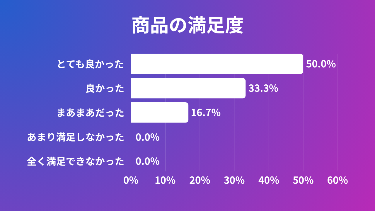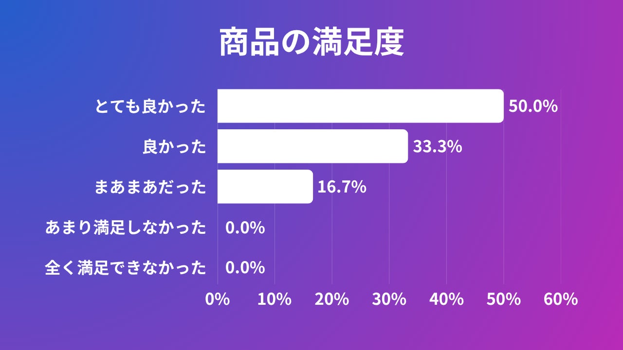 「とても良かった (50.0%)」 「良かった (33.3%)」 を合わせ、83.3%が商品に満足しており、「あまり満足しなかった」 「全く満足できなかった」 という否定的な評価はゼロでした。