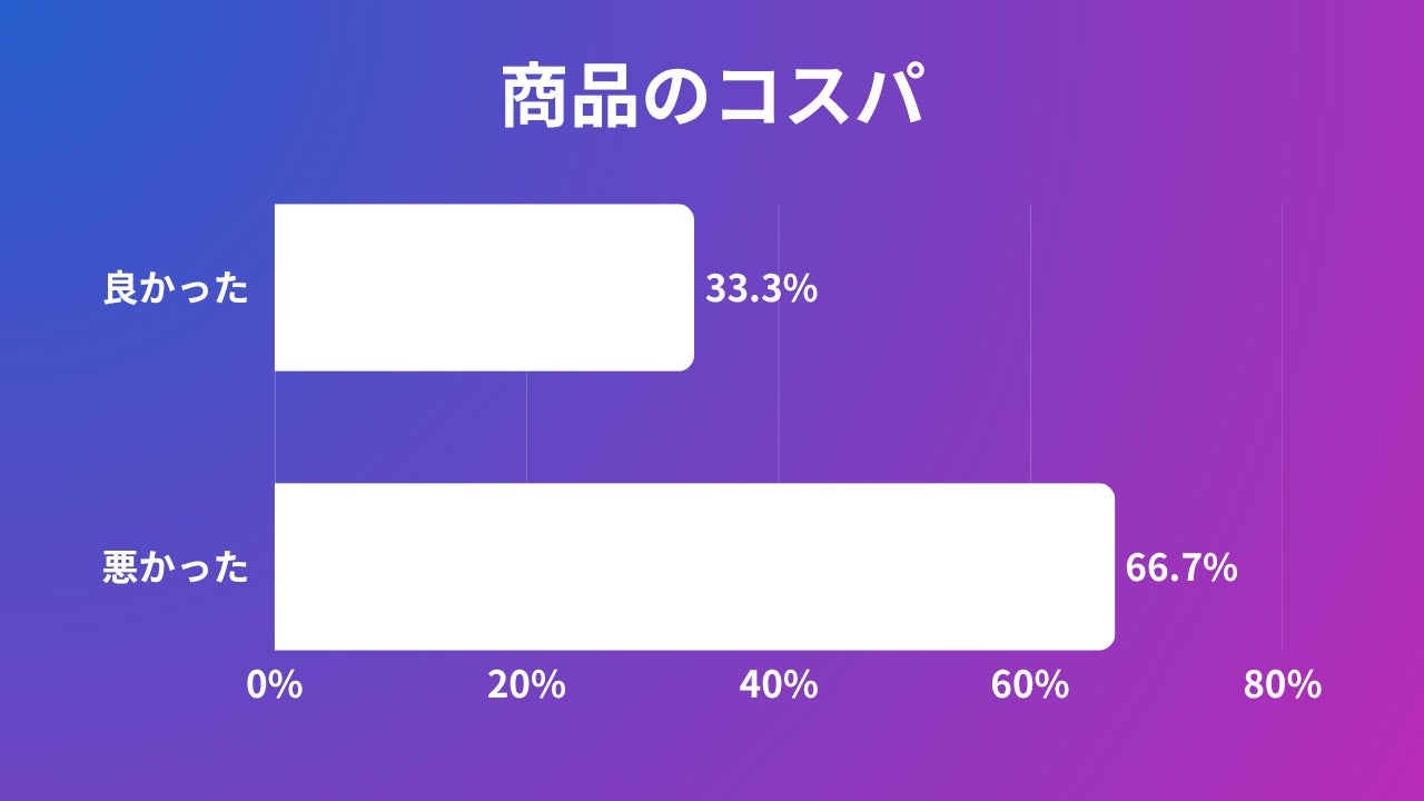 高い満足度とは裏腹に、コストパフォーマンスについては66.7%が 「悪かった」 と回答。楽しい体験への対価として支払う意思はあるものの、価格設定に割高感を感じている顧客が多い実態が明らかになりました。