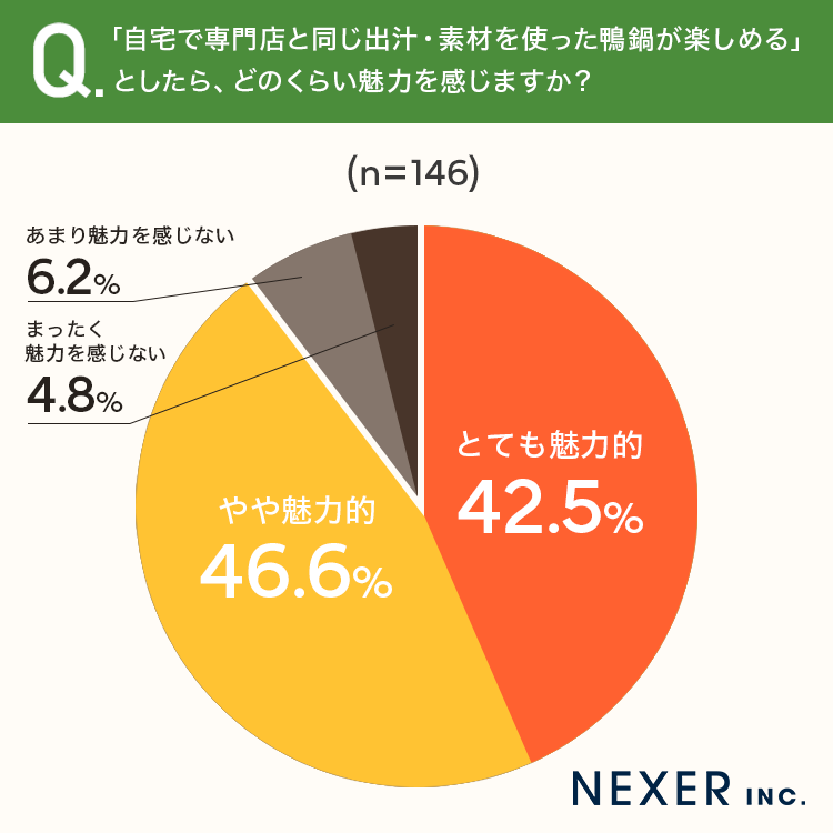 最後に「自宅で専門店と同じ出汁・素材を使った鴨鍋が楽しめる」としたら、どのくらい魅力を感じるか聞いてみました。