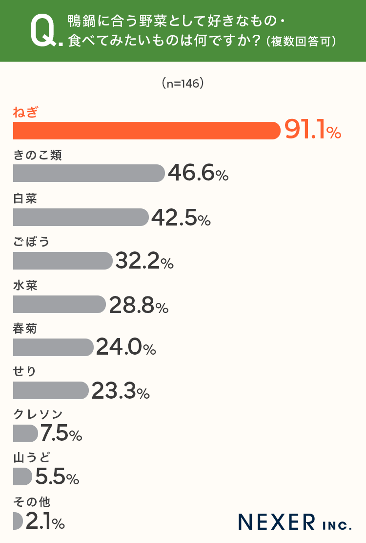 ■91.1%が、鴨鍋に合う野菜として「ねぎ」と回答