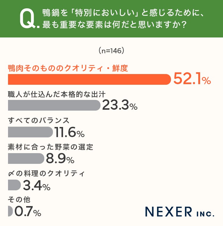 ■52.1%が、鴨鍋で最も重要な要素として「鴨肉そのもののクオリティ・鮮度」と回答