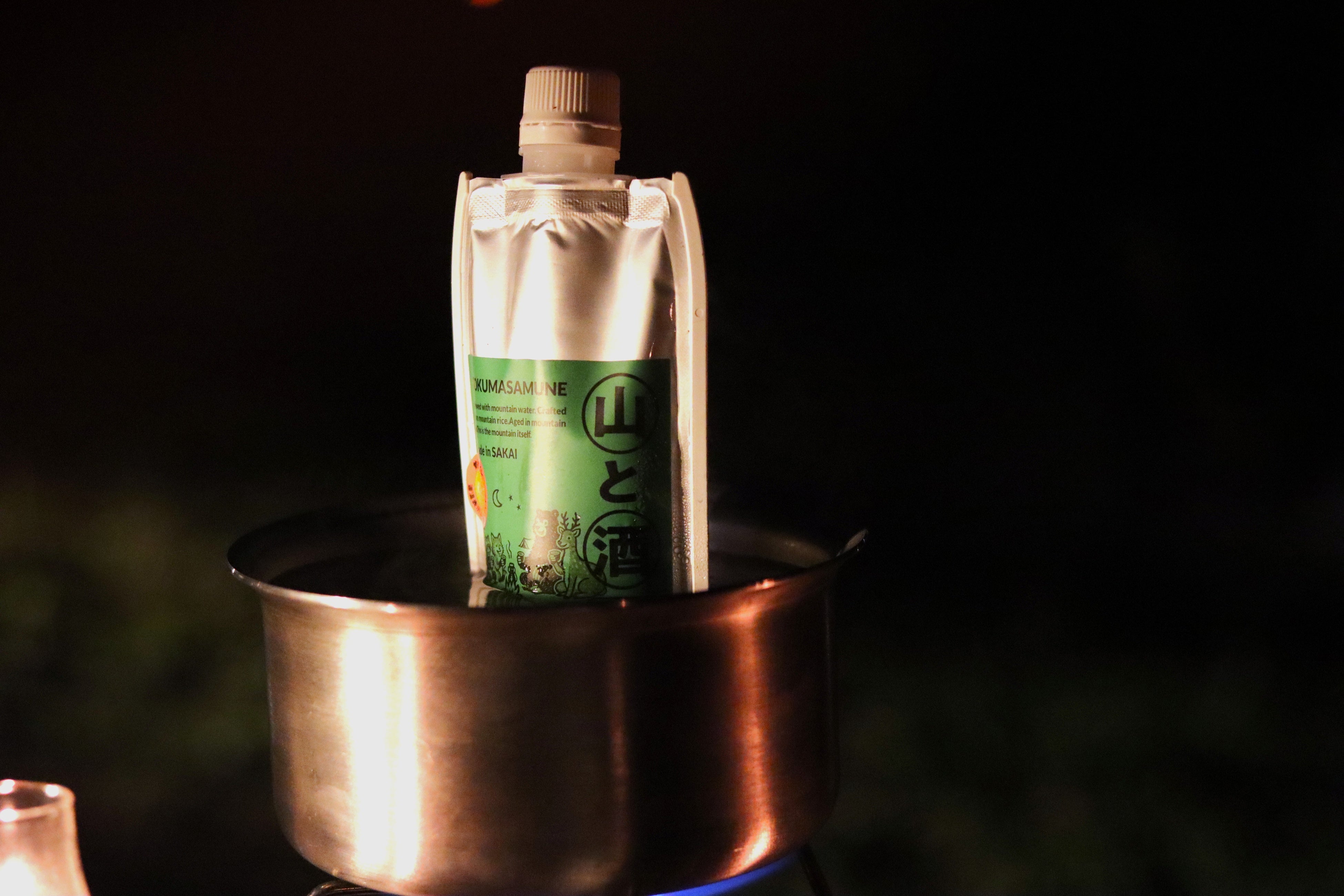 冬は焚き火やバーナーで温めて熱燗に。
