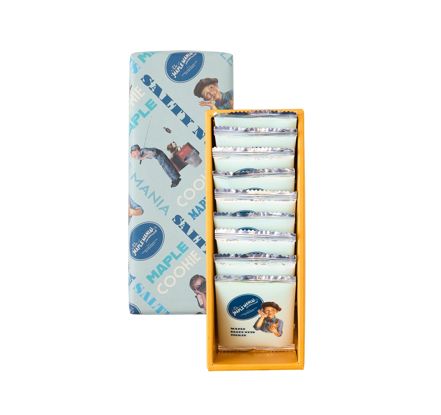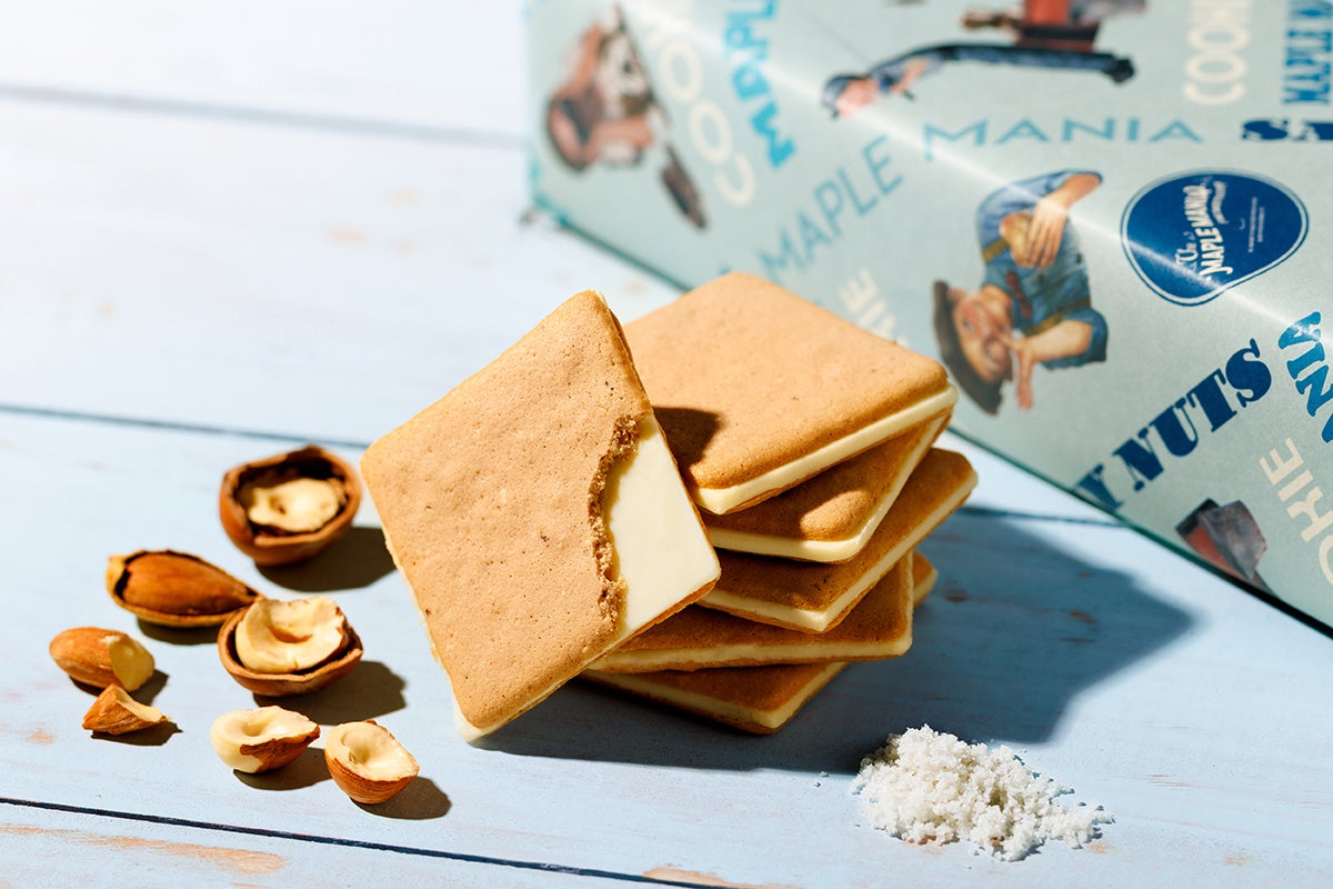 メープルシュガー、ヘーゼルナッツ、アーモンドプラリネを練り込み、塩味を効かせたクッキーでバニ ラ風味のチョコ をサンド。上品なメープルの香りとナッツの香ばしさ、ほどよい塩味が、これからの季 節にぴったりな味わいです。