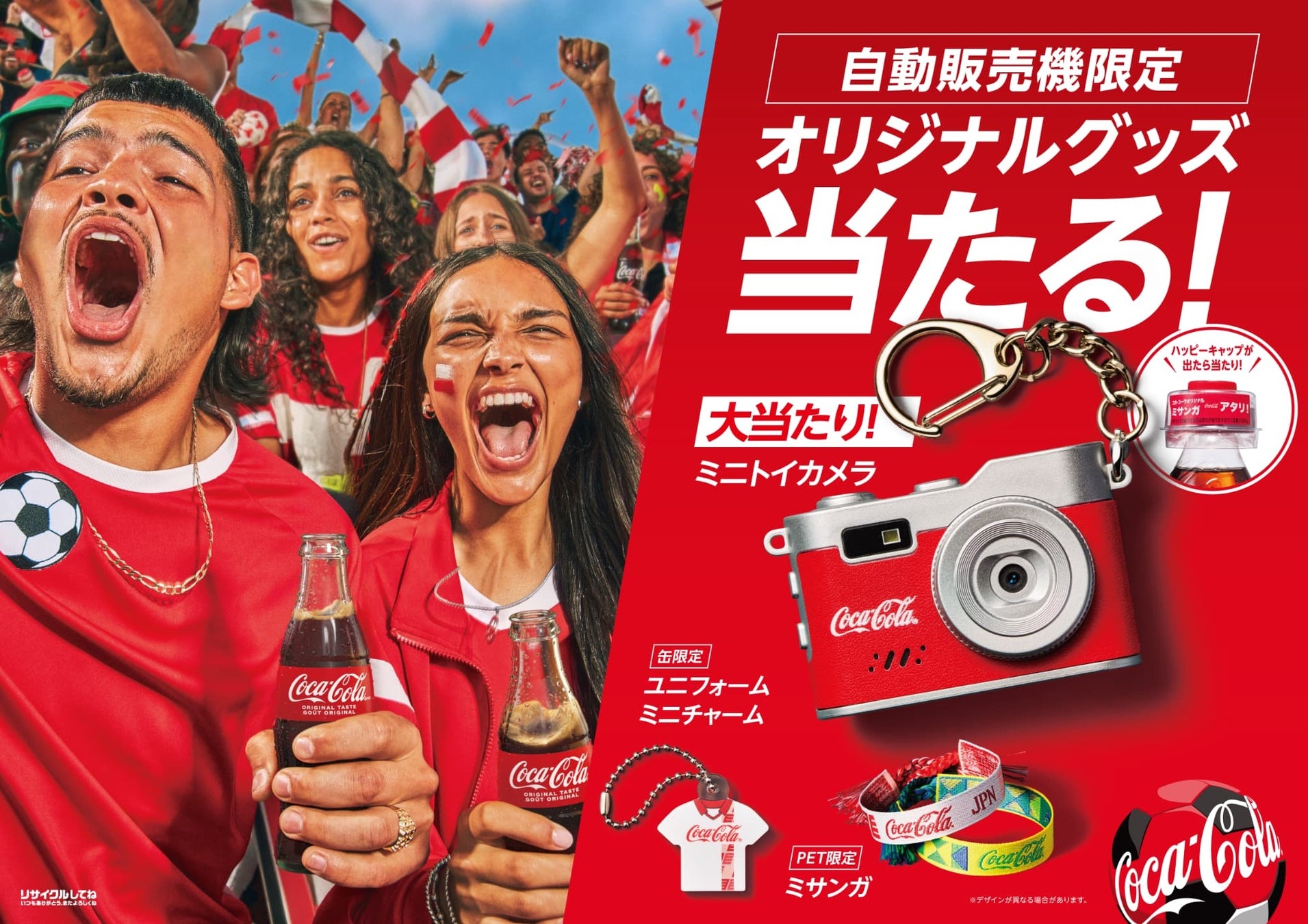 対象の自動販売機で「コカ・コーラ」製品を購入し、製品にキャップがついていたらオリジナルグッズがその場でもらえるキャンペーンを実施します。「FIFA ワールドカップ26」へ参加する人気国をイメージした18カ国のオリジナル ユニフォームミニチャームやオリジナル ミサンガなど、思わず集めたくなる「コカ・コーラ」FIFAオリジナルグッズが当たります。どのデザインが当たるかはキャップを開けてからのお楽しみ。ワクワクドキドキする、「コカ・コーラ」ならではの自動販売機での体験を通じて「FIFA ワールドカップ26」の盛り上がりをさらに高めていきます。