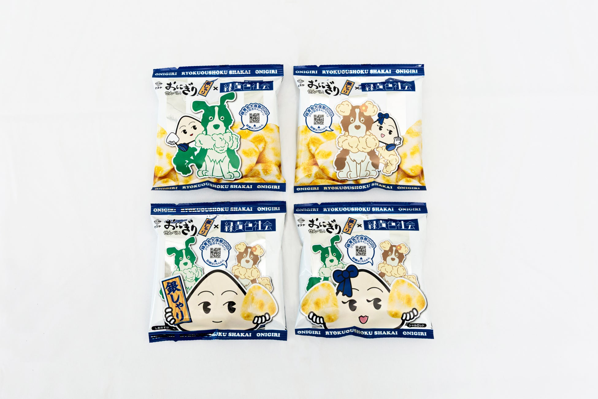 緑黄色社会のマスコットキャラクター「ブロッコリー」&「カリフラワー」と、おにぎりせんべい銀しゃりのマスコットキャラクター「しおのすけ」&「シャルロット」が共演した、かわいらしいパッケージです。デザインは全4種をご用意しています。ライブ会場はもちろん、日常のさまざまなシーンで緑黄色社会の音楽とともにお楽しみください。