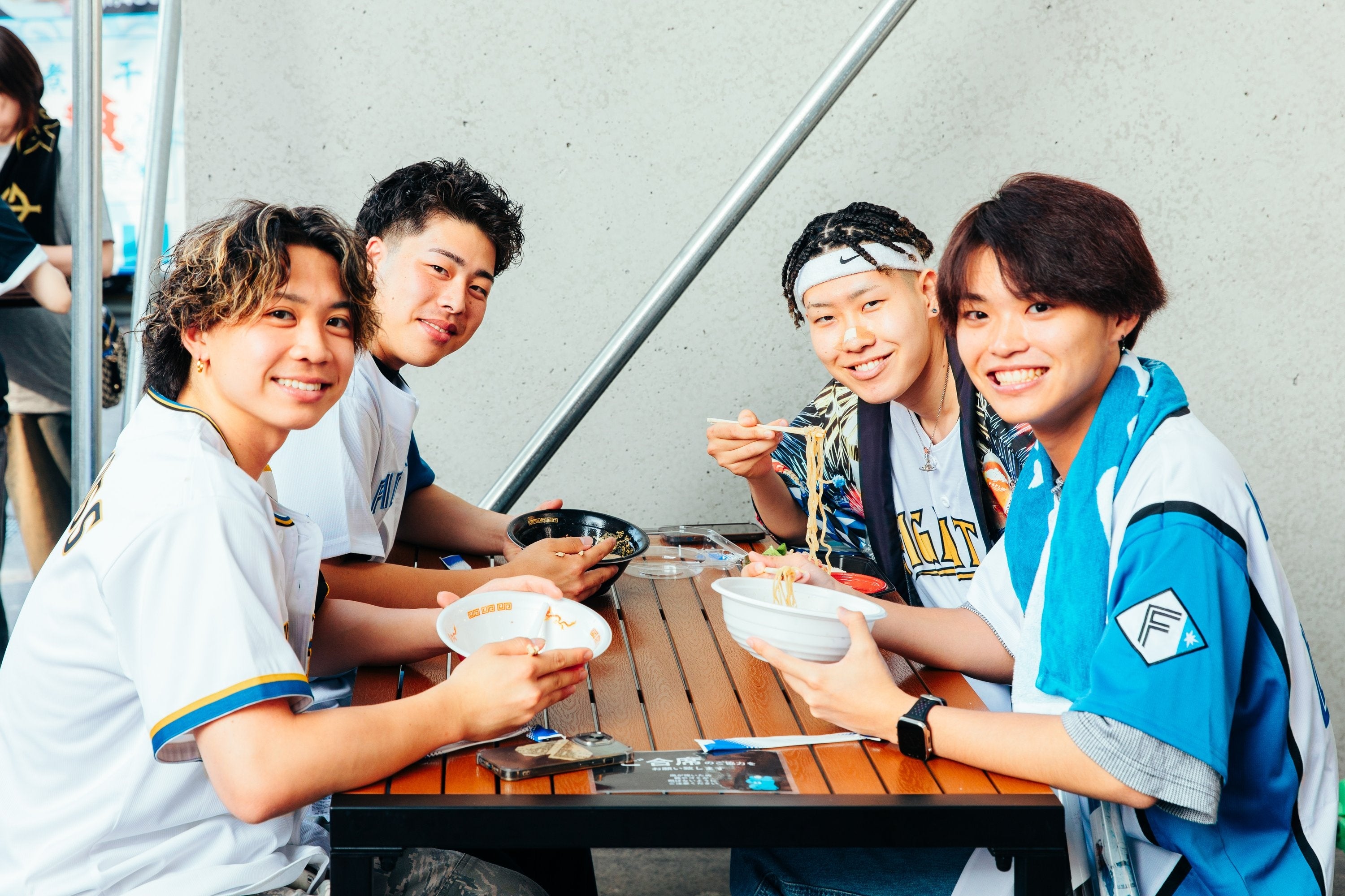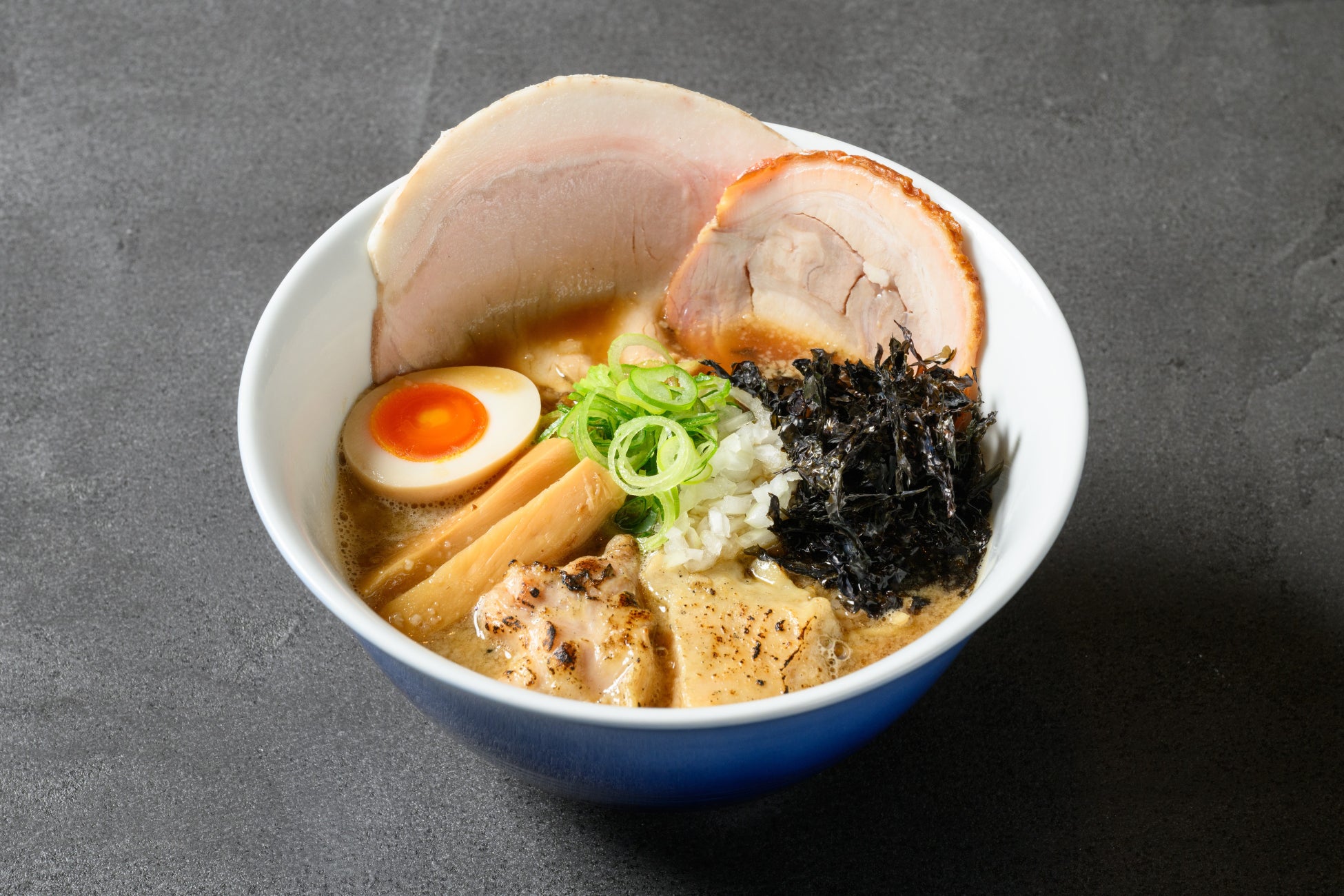 ハマグリと臭みのない豚骨をあわせた自慢のまろやかな濃厚スープ。北海道産の花咲蟹を贅沢に使用した香味オイルと鮮やかなトッピングが煌るエスコン限定の一杯。