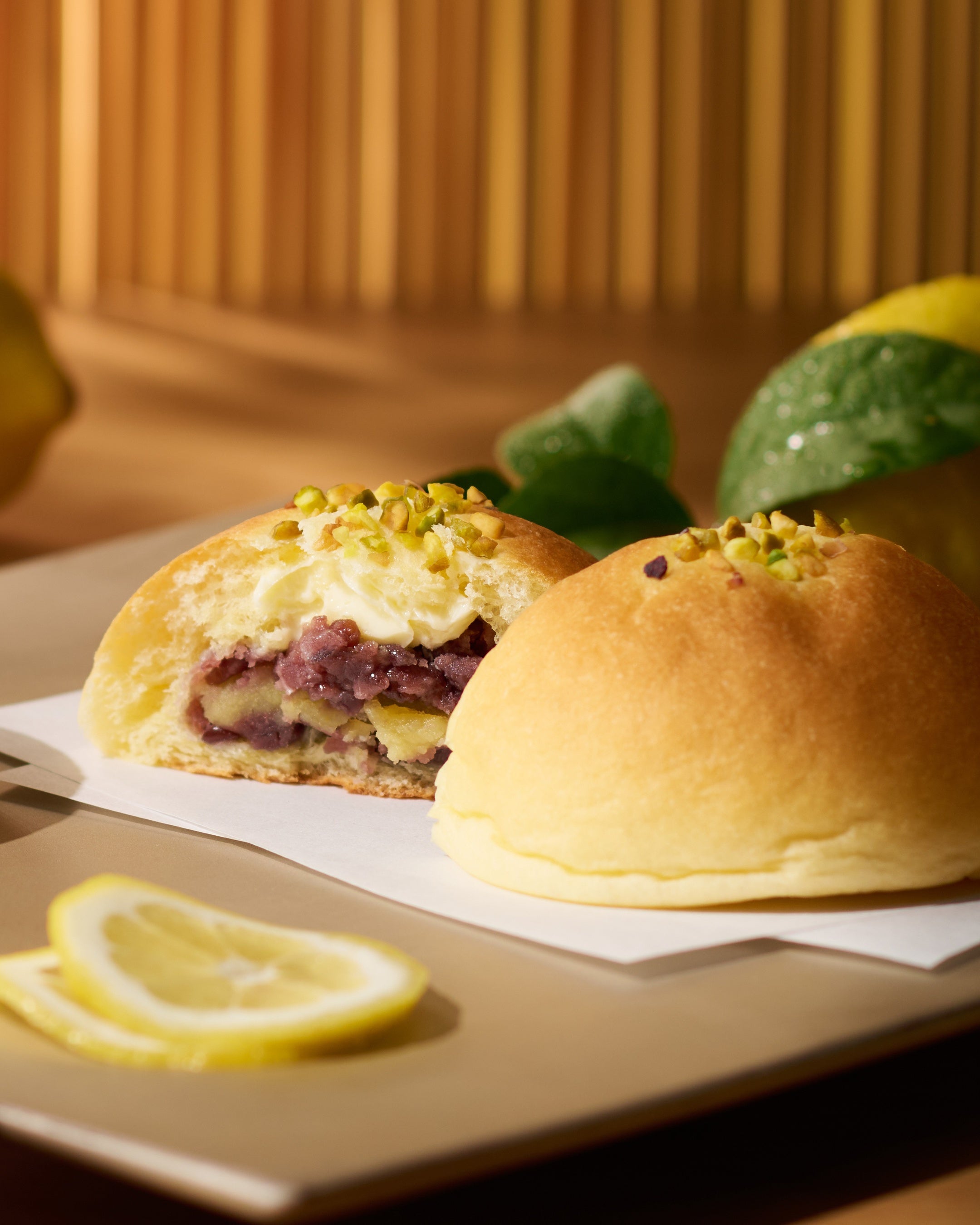 白餡に、優しげな酸味の『瀬戸田レモン』果汁と、皮を丁寧に刻んだピューレをしのばせ、檸檬本来の自然な香りが香る『檸檬餡』に仕立てました。岡田謹製『餡子』と爽やかな『檸檬餡』が調和し、トッピングのピスタチオの彩りと檸檬の香りが誘う、涼やかで上品な味わいの一品に仕上げました。