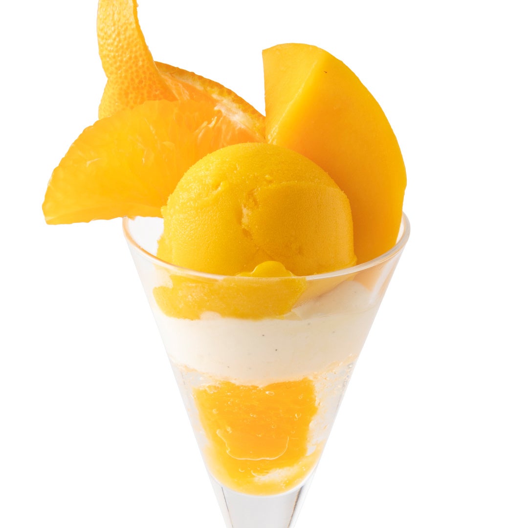 マンゴー特有のトロピカルな香りを感じる店内製造シャーベットと、マンゴーオレンジジュース、コアントローゼリー、ディプロマットクリームを重ねたパフェです。