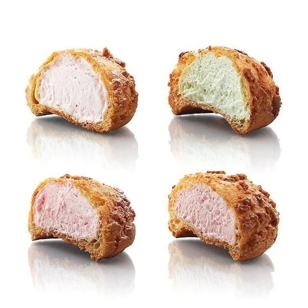 ザクザク食感のクッキーシューに、あかつき桃のクリームがたっぷり詰まった人気の「桃香」。さらに「桜香」「梅香」「香の苺」を加えた4種セット。国産純生クリームをブレンドした、上品でやさしい甘さのシュークリームです。