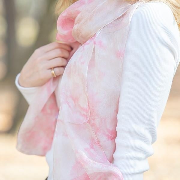 薄く軽やかで、やさしい肌触り。極細の生糸を丁寧に織り上げ、ふんわりと温かみのある仕上がりに。手染めのため一枚ごとに表情が異なる一点ものです。大判サイズでアレンジも自在。