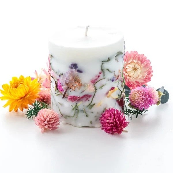 廃棄される花々を活かし、ドライフラワーで仕上げた一点もののキャンドル。天然ソイワックス使用で煙が少なく、精油の香りが穏やかに広がり、心身の緊張をほぐしてくれます。